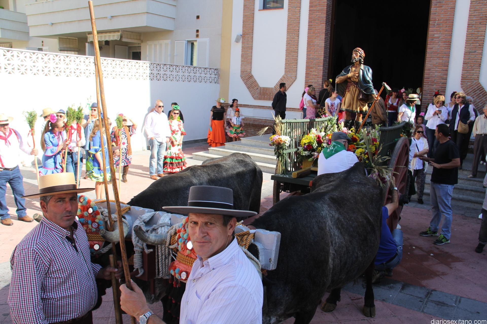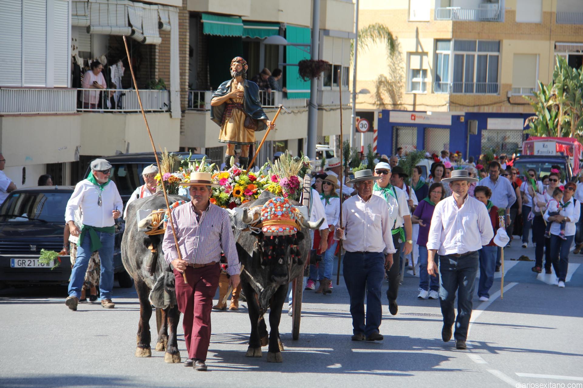 El cortejo, encabezado por la Imagen de San Isidro que ocupaba un carro tirado por una pareja de bueyes venidos desde la localidad malagueña de Almayate, partió una vez finalizada la misa en Honor de San Isidro y los romeros , como viene siendo habitual, poniendo rumbo hacía el barrio de Torrecuevas. Eran casi las 10,30 de la mañana cuando salía el cortejo desde la Iglesia del Salvador, contando para ello con el apoyo de la Policía Local y Protección Civil. Estos tuvieron una destacada actuación en los distintos cruces urbanos y acceso hasta la Vega de Rio Verde, camino del río Verde y posteriormente hacia Torrecuevas.