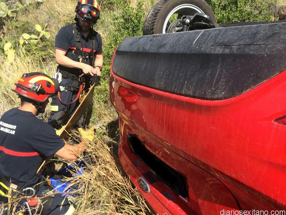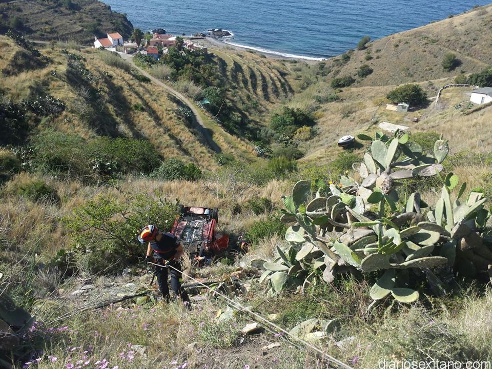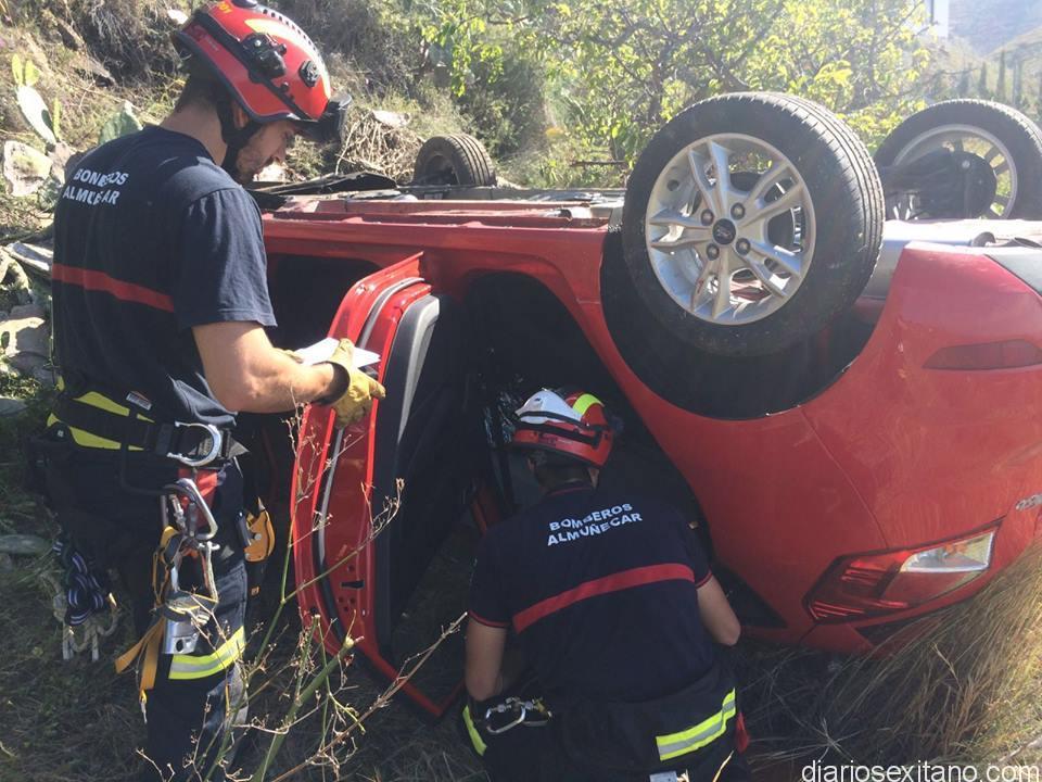 Los Bomberos de Almuñécar tuvieron que emplearse a fondo para rescatar a una mujer tras salirse de la vía el vehículo que conducía.