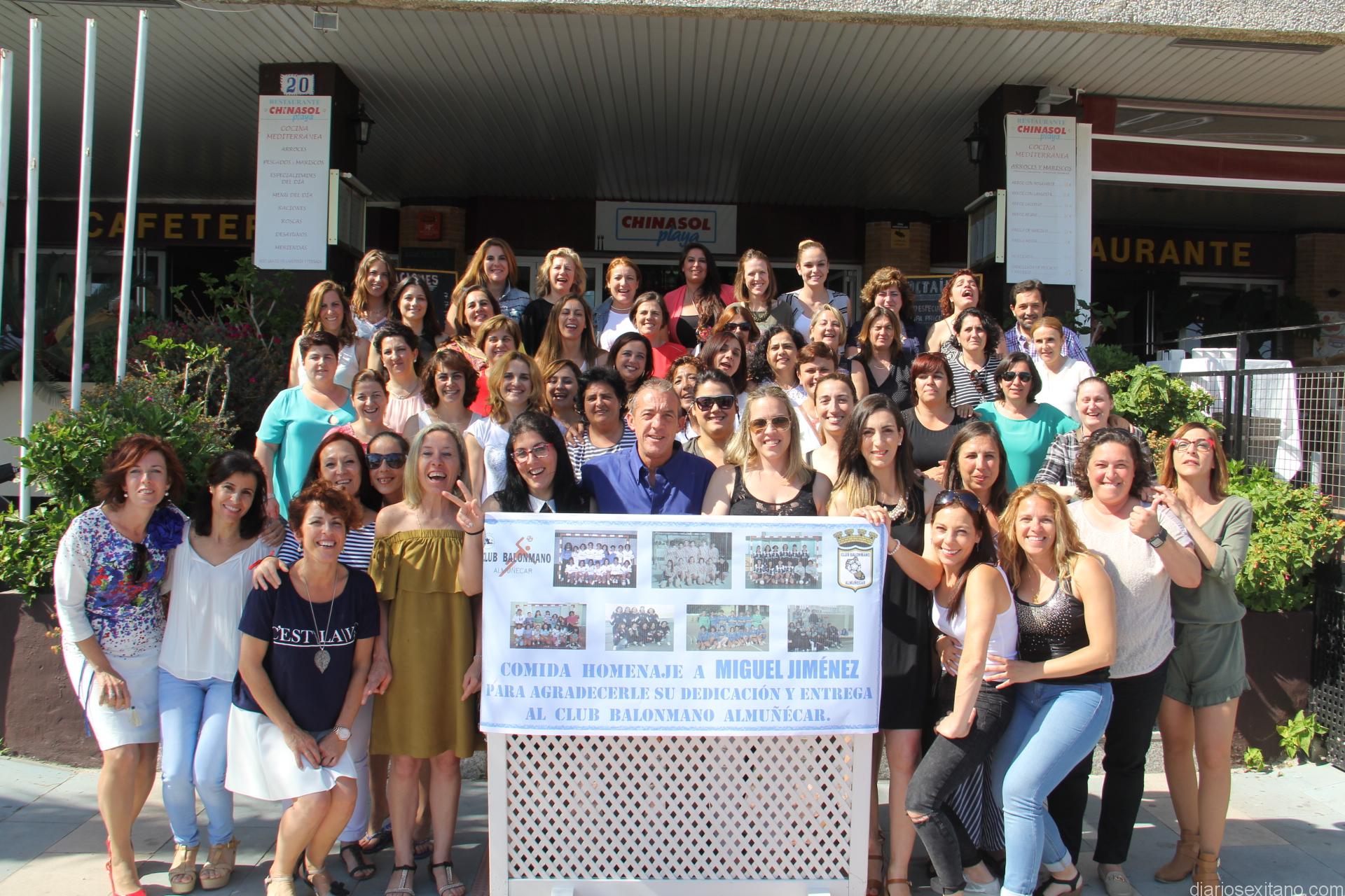 La mayoría de exjugadoras del Club Balonmano Almuñécar se pusieron de acuerdo para celebrar una comida en restaurante “Chinasol Playa” y rendir ”homenaje sorpresa” al que fue su entrenador, Miguel Jiménez Corral, y agradecerle su dedicación y entrega al citado Club , creado hace más de 25 años. En el acto, emotivo y entrañable para el homenajeado y las participantes, no faltaron los comentarios de vivencias y anécdotas compartidas. No pudieron estar todas por motivos de trabajo o vivir fuera de España, pero las que asistieron las tuvieron muy presentes… Ahora, muchas de las ex jugadoras, son madres de las actuales componentes de las distintas categorías, que tienen la trayectoria definida de lo que sigue siendo un referente en el Balonmano Granadino y Andaluz. Felicidades Miguel.