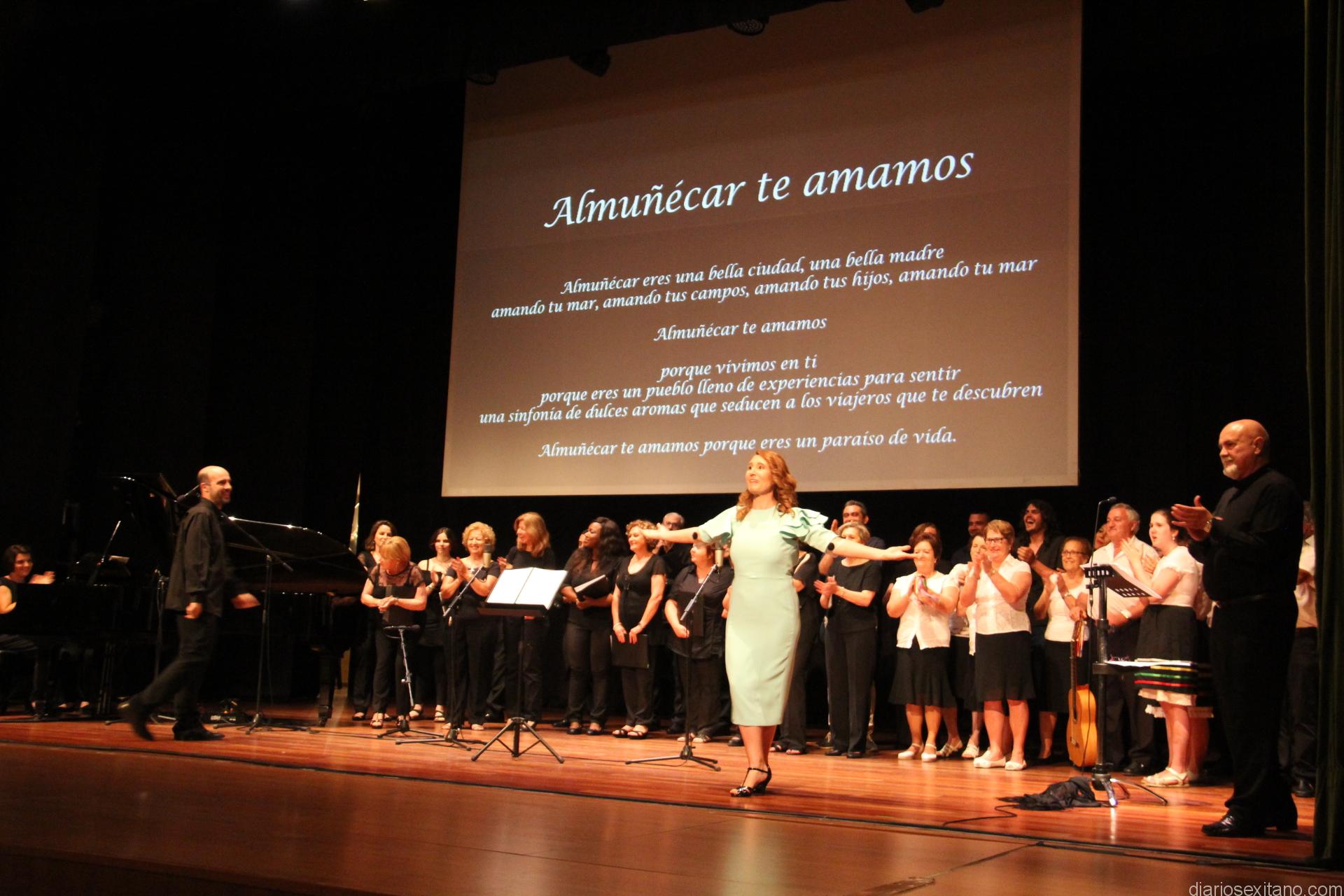 Durante más de una hora de recorrido y actuaciones, donde el Coro de Juventudes Musicales, que tuvo una bella interpretación en la apertura del pasodoble Almuñécar, estrenaba el himno: “Almuñécar, te amamos”, escrito por la propia, Esmeralda Jiménez, con música de Rodrigo Guerrero, que sirvió también como broche final cantado por todos los asistentes.