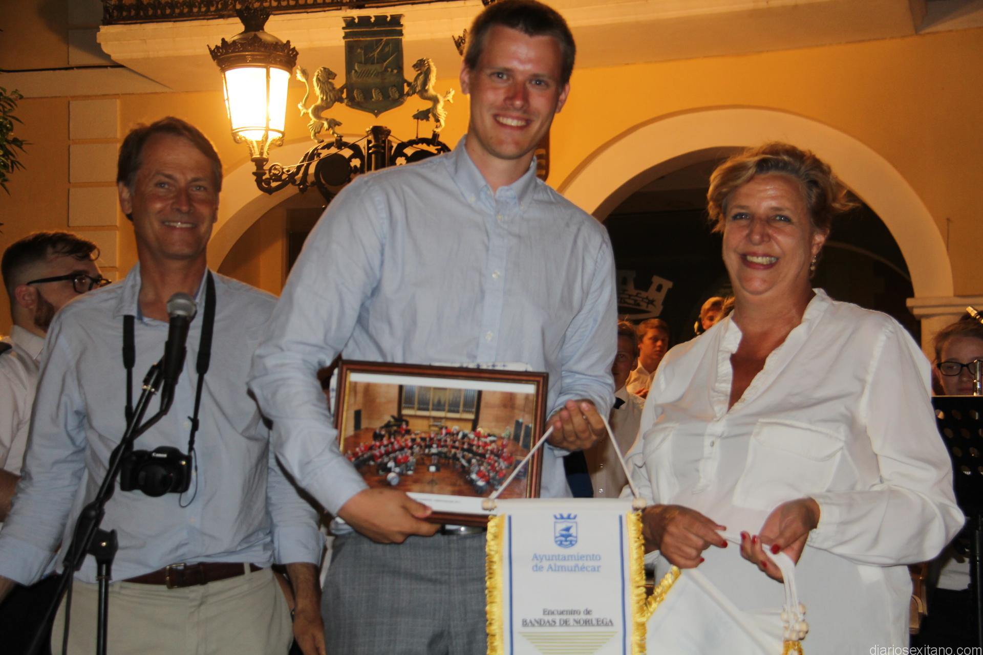 Olga Ruano, que agradeció a Peter Claëssons, promotor del evento, su apuesta por Almuñécar en su cuarta edición, hizo entrega de unos banderines y diploma a las bandas que actuaron en el quinto concierto que ponía el broche al IV Festival Tropical de Bandas de Música Nórdicas, que tuvo lugar en la plaza de la Constitución, junto al Ayuntamiento, ante cientos de personas, los cuales disfrutaron de cuatro horas de música.