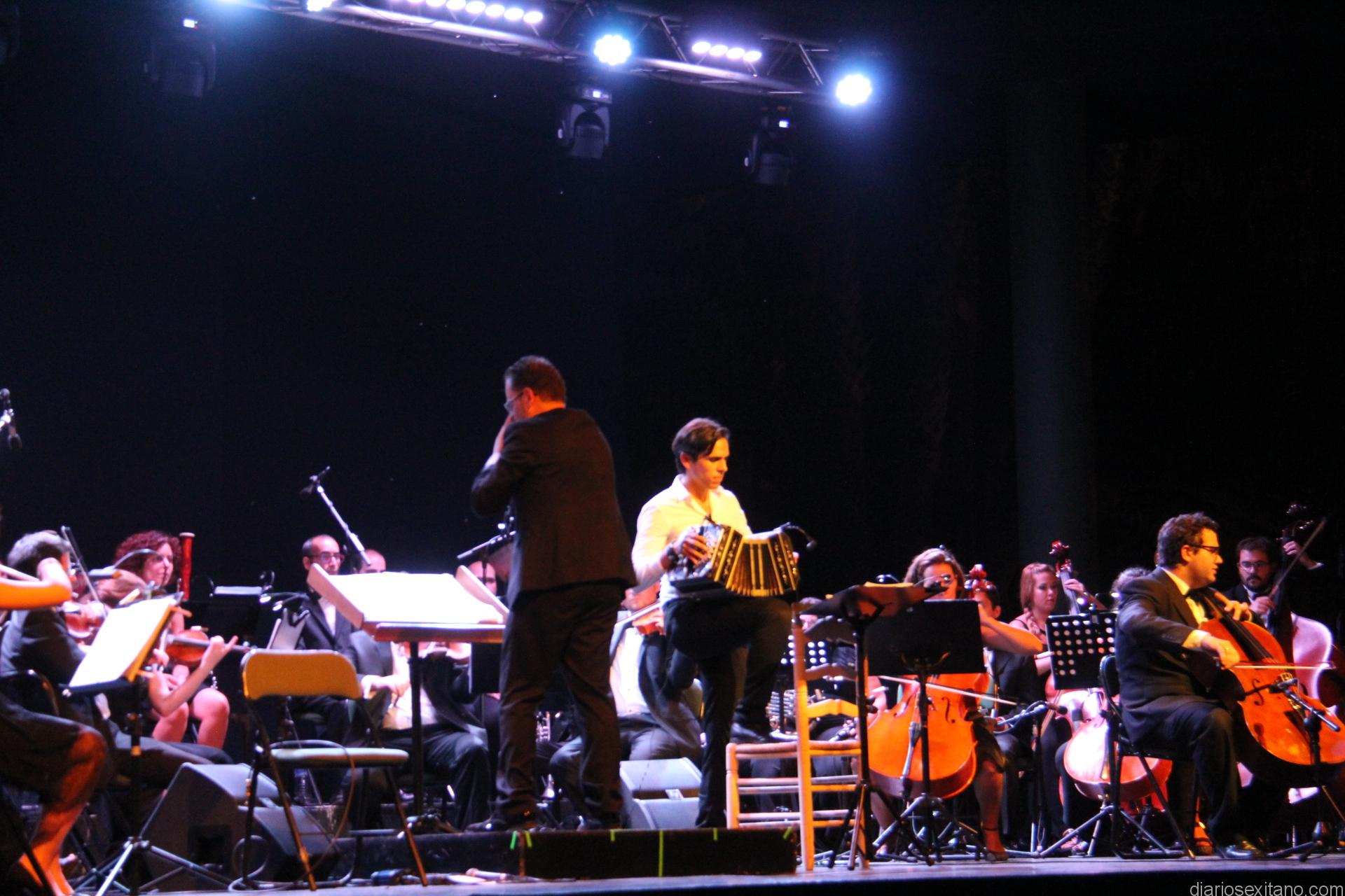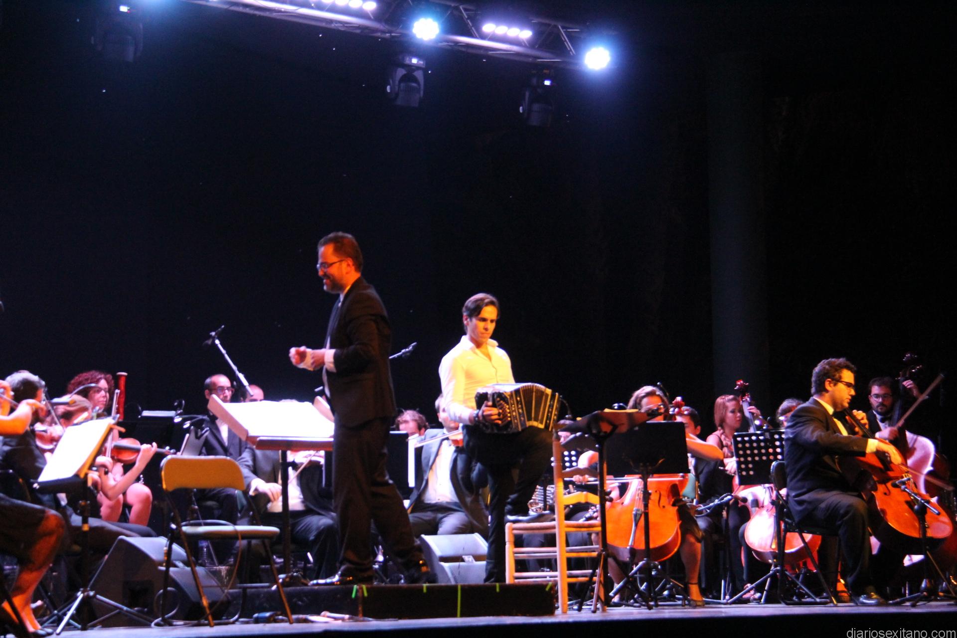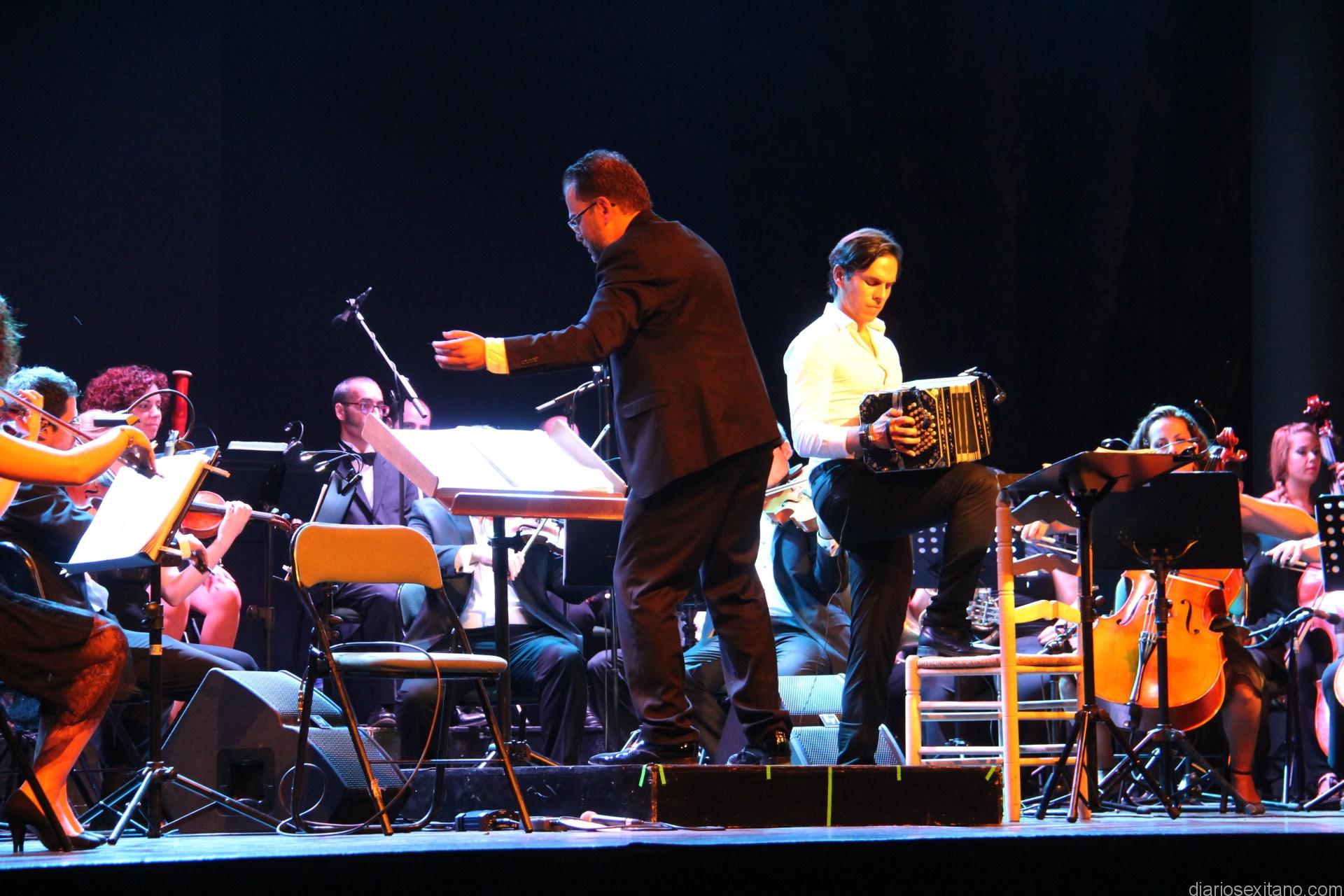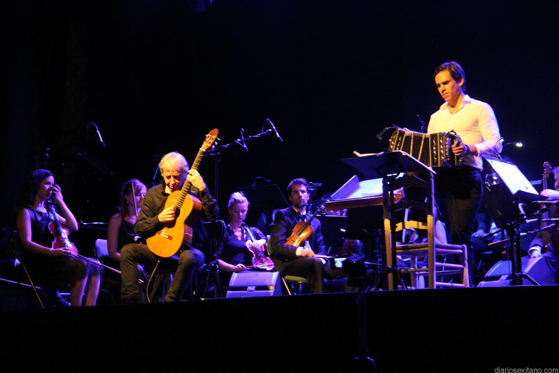 Sobre el escenario del auditorio del parque El Majuelo una gran orquesta con medio centenar de músicos, la guitarra de Fernando Egozcue, el bandoneón de Claudio Constantini y la participación de una pareja de baile de tango, John y Alejandra. Todos juntos ofrecieron un bello espectáculo que disfrutó el público con las composiciones de Astor Piazzolla o propio Fernando Egozcue. Precisamente, el broche del concierto lo puso la interpretación de “Las cuatro estaciones” de Piazzolla.