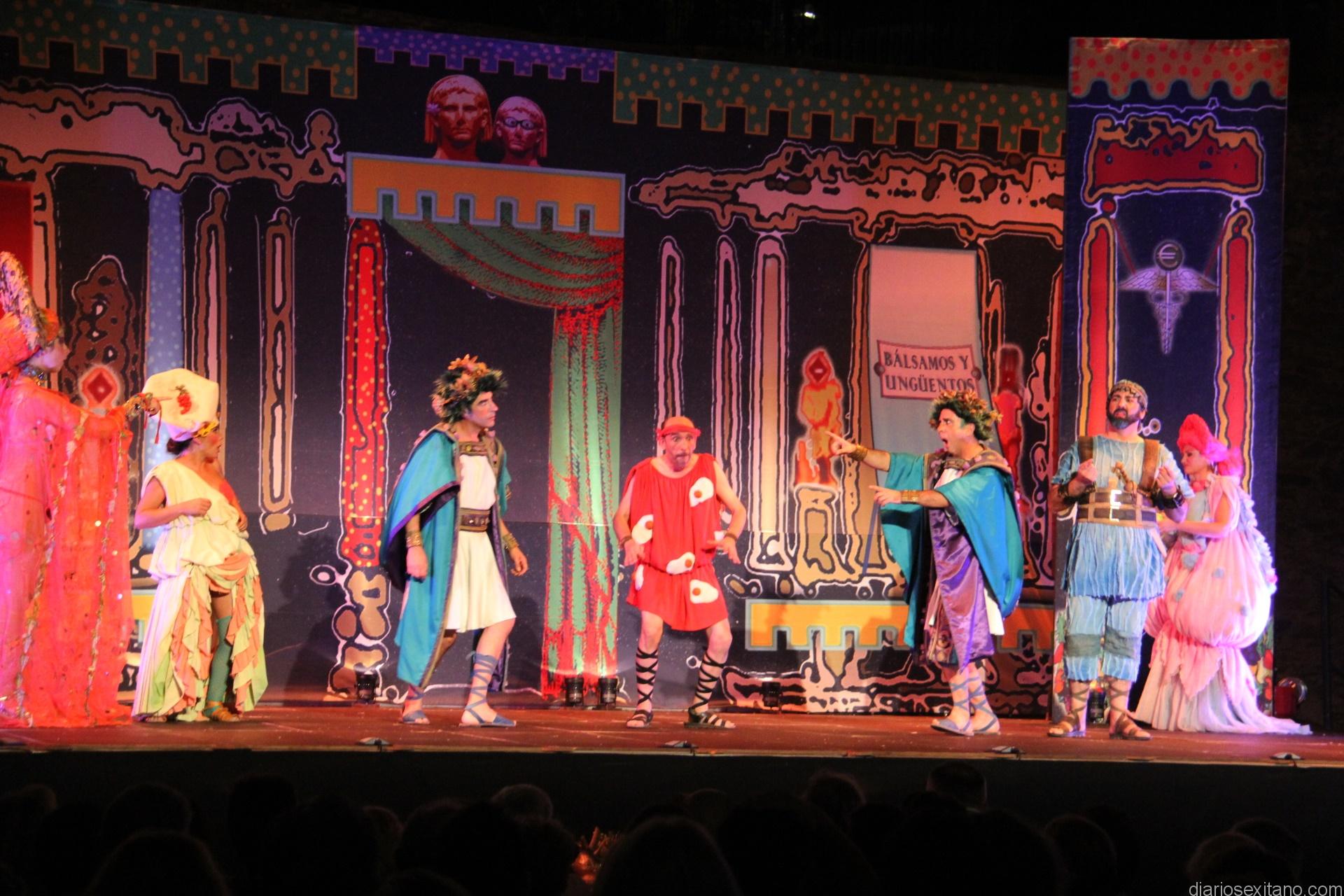 La representación estará a cargo del grupo extremeño, Verbo Producciones, que anoche se presentaba en el festival sexitano con éxito total representando la obra “Los Gemelos” de Plauto. Fue tal la demanda de entradas por parte del público que la organización tuvo que ampliar el aforo del espacio abierto del Acueducto Romano de La Carrera.