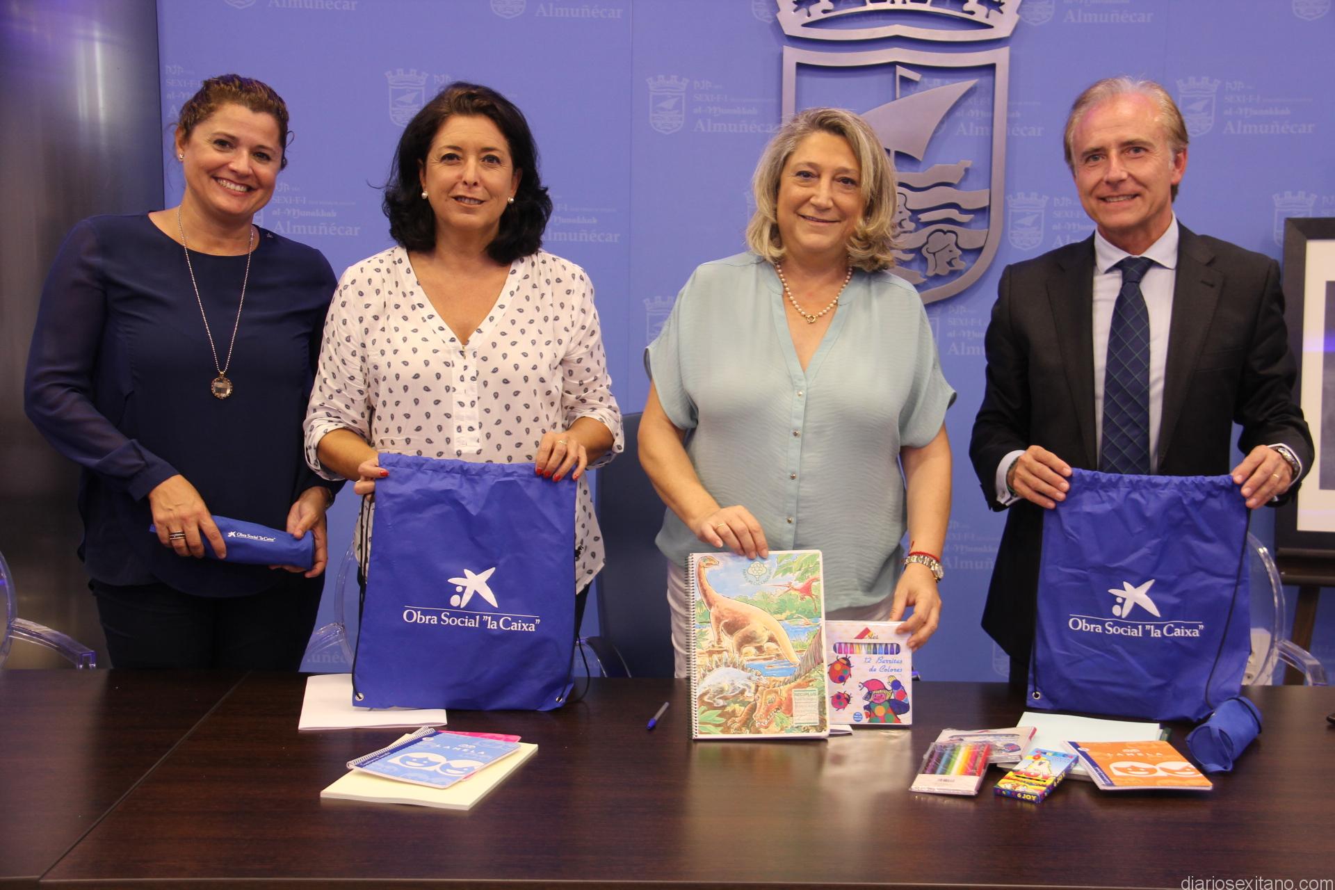 Unos doscientos alumnos sin recursos del municipio sexitano recibirán en los próximos días una mochila con material escolar donado por la Obra Social de La Caixa. Este material ha sido presentado y entregado a la alcaldesa, Trinidad Herrera Lorente, por parte de los responsables de La Caixa para la zona Sur de Granada y el municipio de Almuñécar, Juan Dionisio González y Encarnación López, respectivamente.