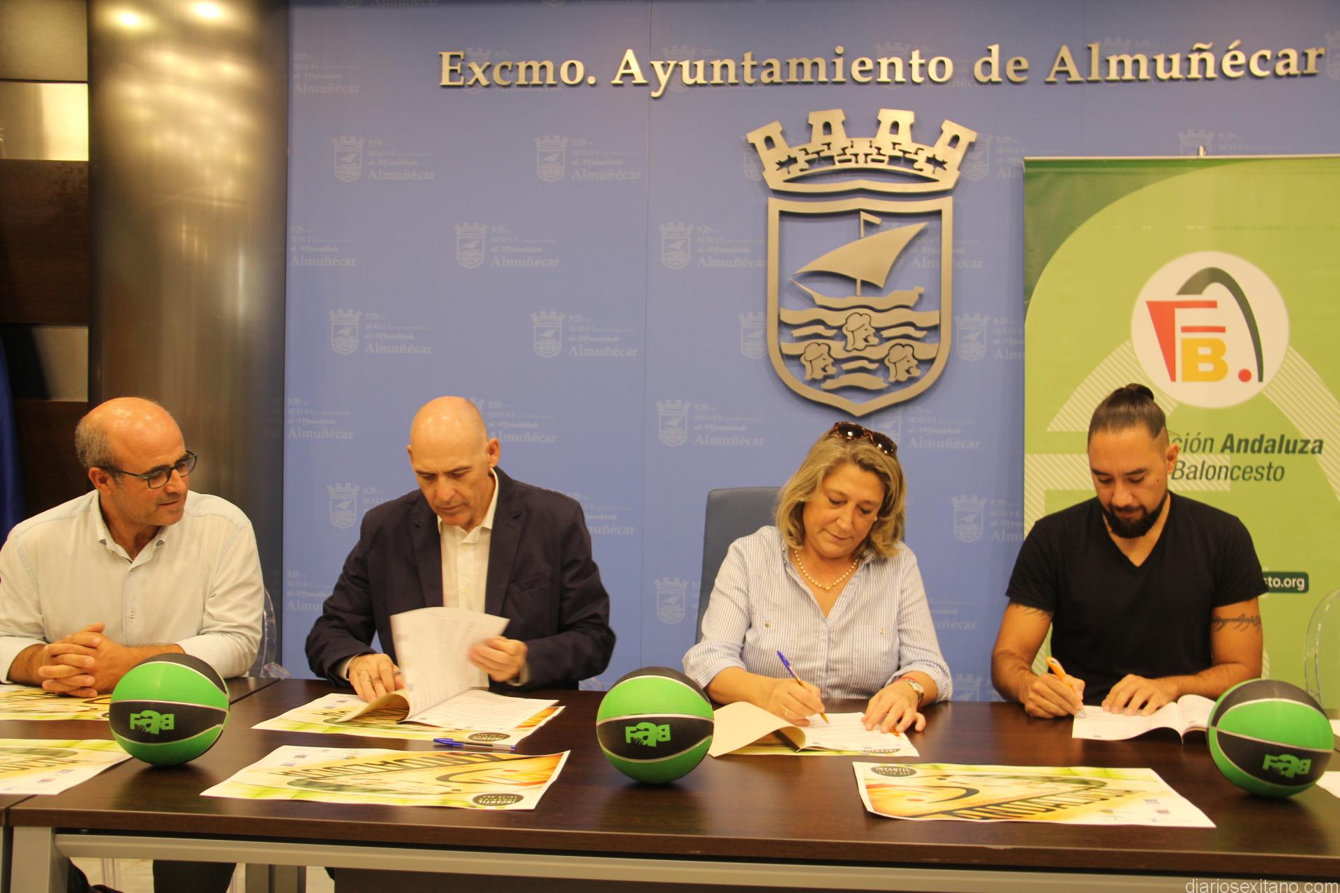 La alcaldesa de Almuñécar y el delegado de provincial de la Federación del Baloncesto han firmado el convenio y presentado el evento