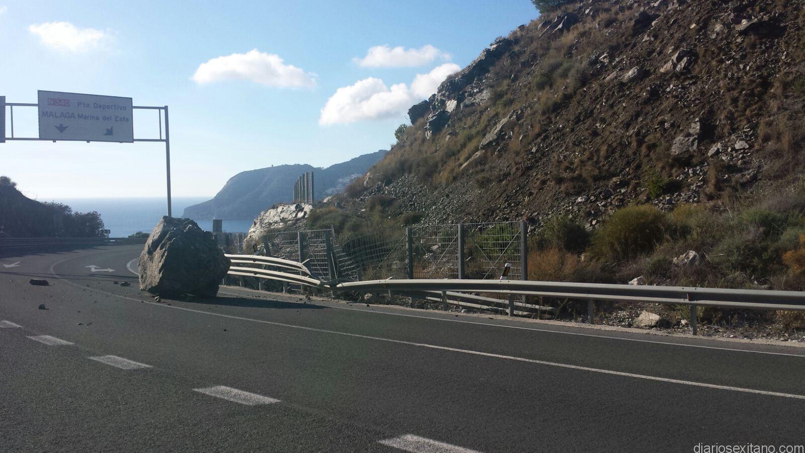 Una piedra de gran tamaño -varios metros cúbicos- se ha desprendido de un talud de la Carretera Nacional 340 y tras romper la valla de protección instalada en la zona, ha caído sobre ésta vía ocupando el carril en dirección a Málaga , a la altura del kilómetro 309,8 , cerca del acceso a la urbanización Punta de la Mona y puerto deportivo Marina del Este.