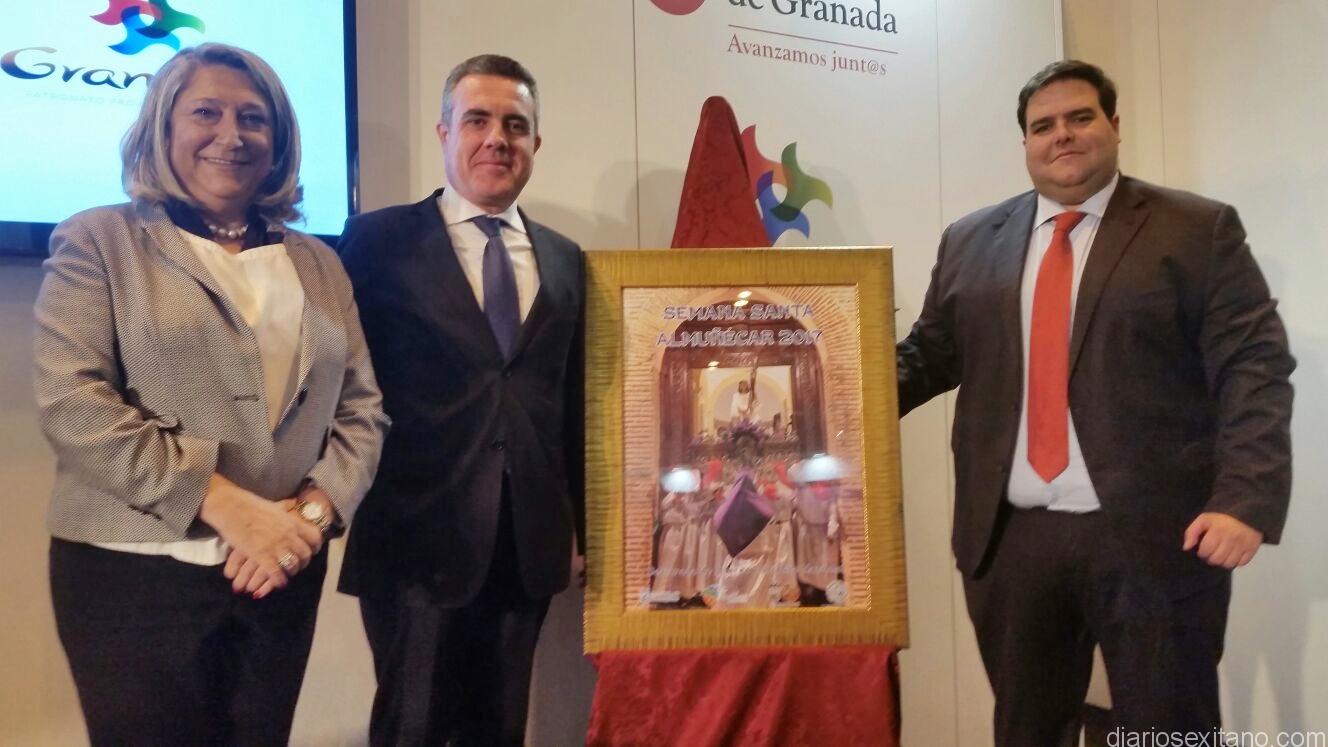 La alcaldesa de Almuñécar, Trinidad Herrera Lorente, y el presidente de la Agrupación de Cofradías y Hermandades Javier Zarzos, acompañados del concejal de Turismo, Rafael Caballero, han presentado el cartel oficial de la Semana Santa sexitana 2017, declarada de Interés Turístico de Andalucía, “en apoyo y divulgación de las tradiciones y expresiones culturales, cívicas y religiosas, sin olvidar el fomento de la actividad turística que dichas manifestaciones conllevan”, dijo la alcaldesa.