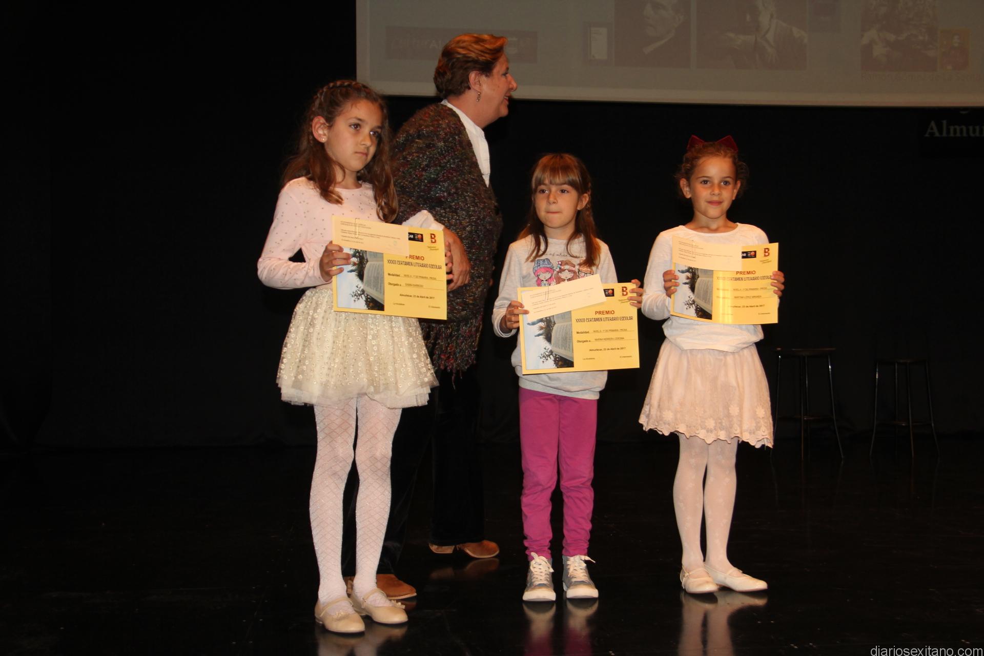 La concejal de Cultura, Olga Ruano, acompañada de las actrices y presentadoras del acto, Margarita Saldivia y Sonia Llamas, fueron las encargadas de entregar los 96 diplomas y premios a los alumnos galardonados en las distintas modalidades del XXXIII Certamen Literario Escolar de Almuñécar, que convoca la Concejalía de Cultura y Educación del Ayuntamiento sexitano, bajo la coordinación de la Biblioteca Municipal sexitana.