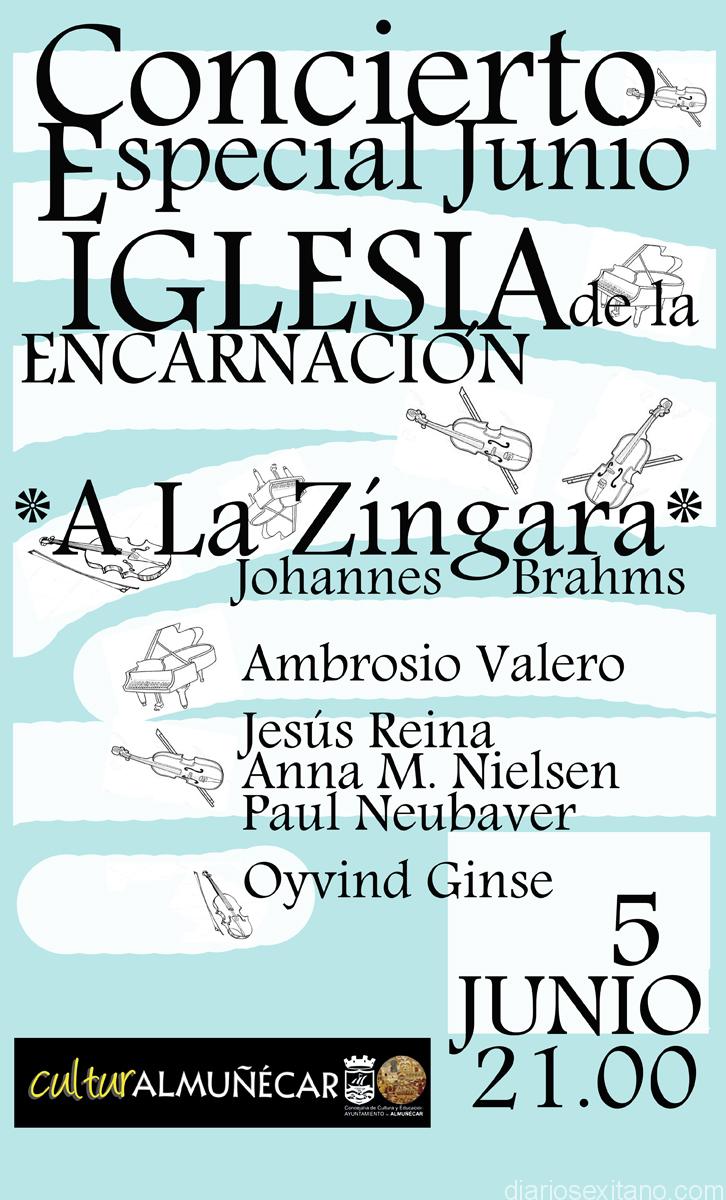 Bajo el título “A la Zíngara” la Concejalía de Cultura del Ayuntamiento de Almuñécar celebra este lunes día 5, desde las 21 horas y en la Iglesia Parroquial de la Encarnación un interesante concierto con un programa que arrancará con la obra “Serenade para trío de cuerda en Do mayor, Op. 10”, de E. Dohnanyi y que concluirá con Joanes Brahms y su obra “Cuarteto para piano y cuerda Número 1 en sol menor, Op.25”