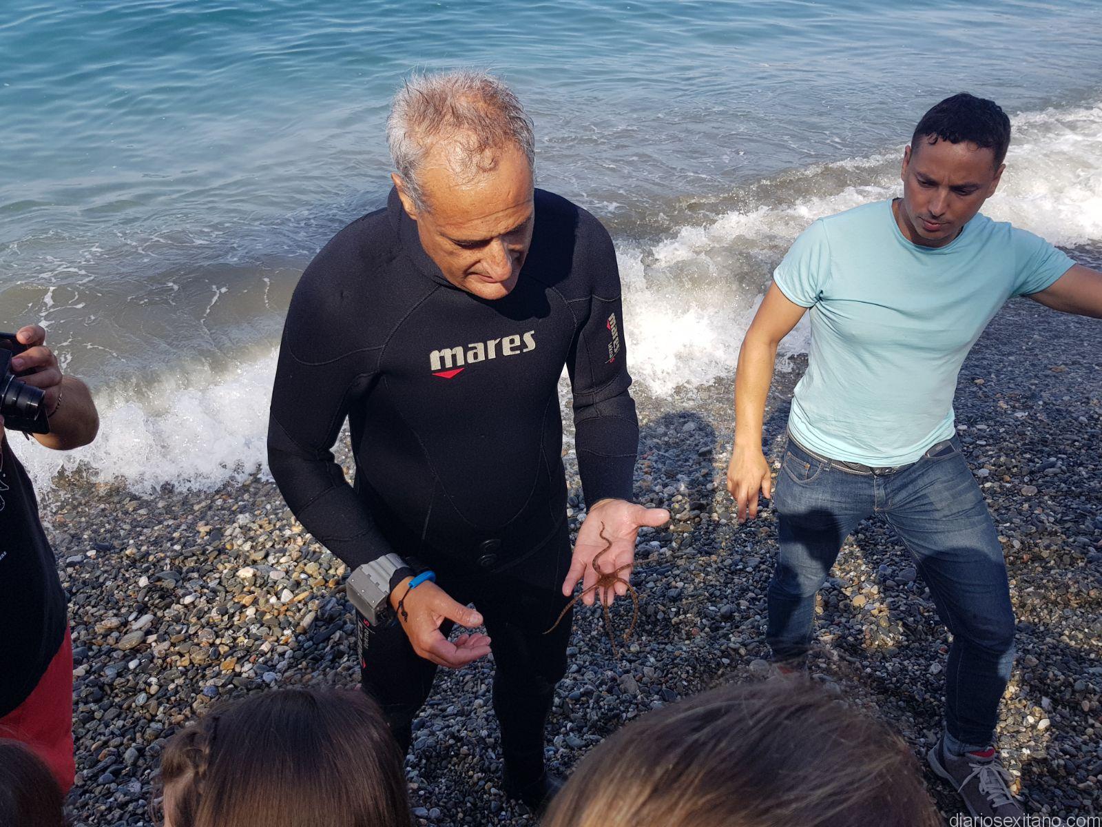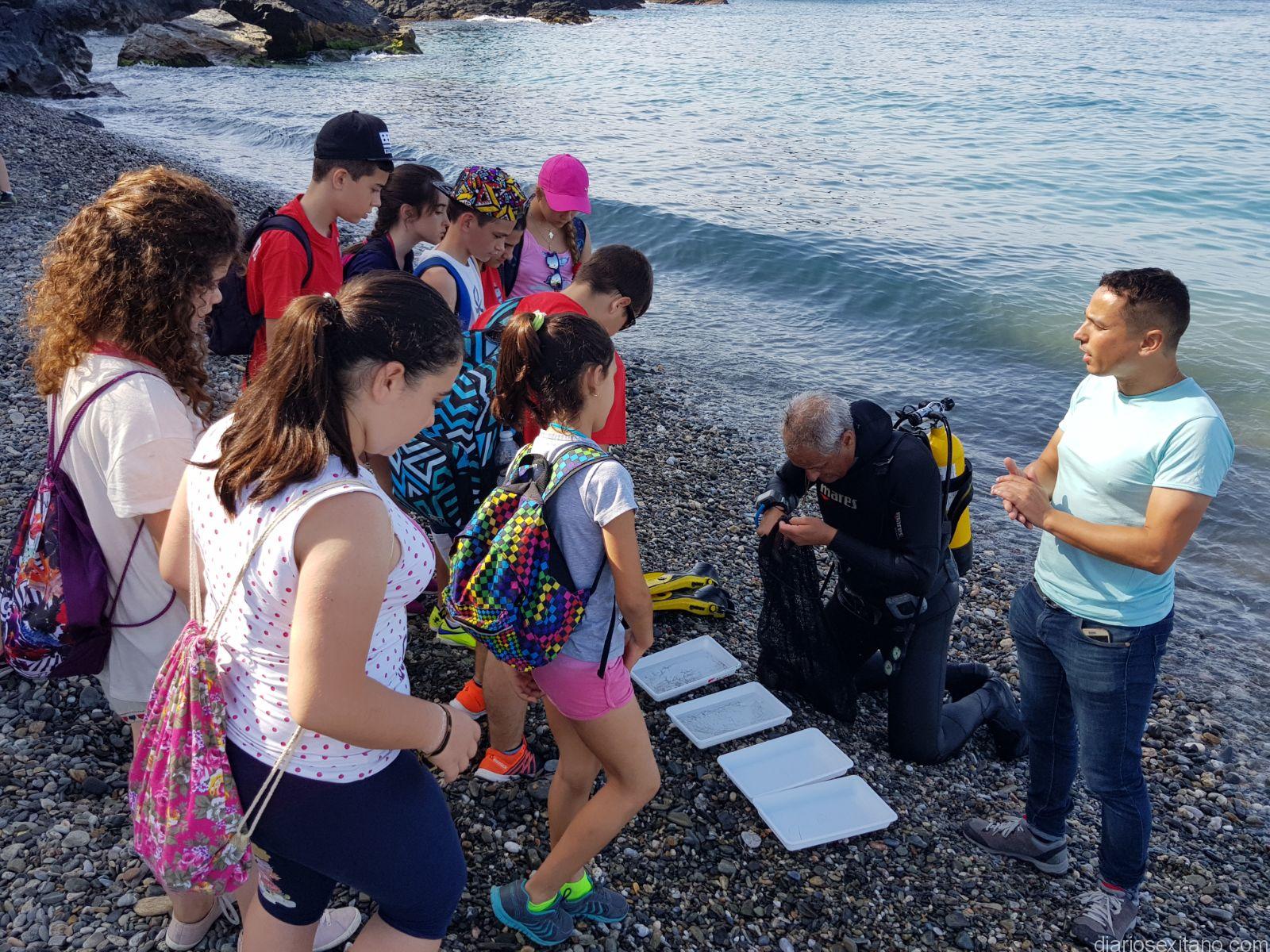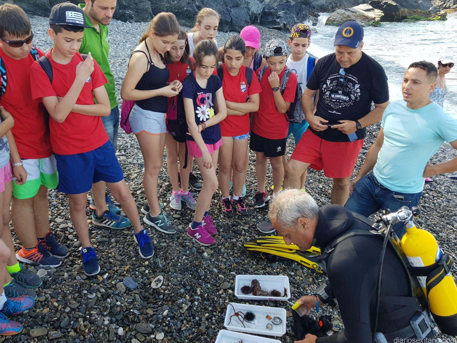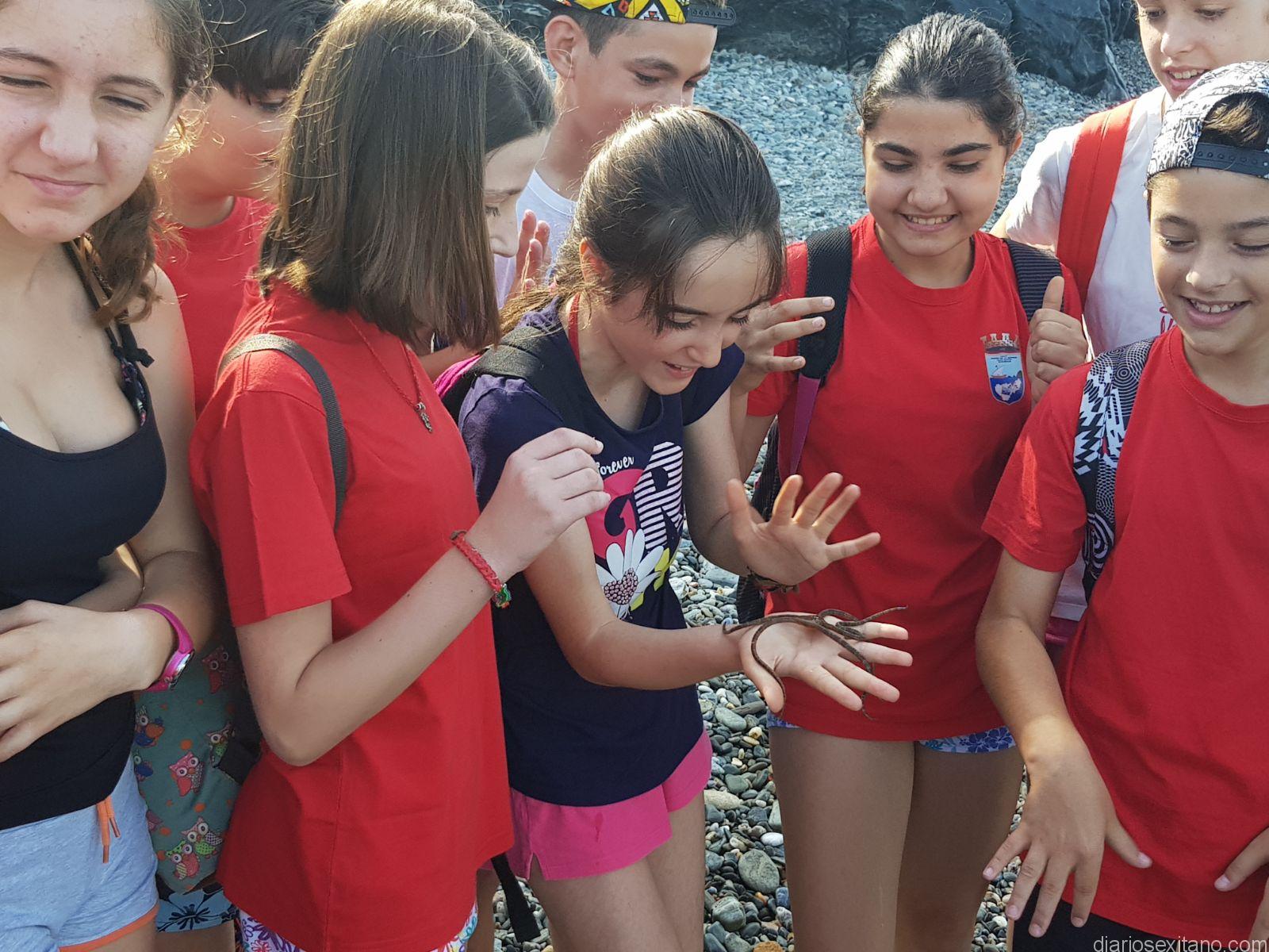 A continuación, los jóvenes bajaron a la playa, donde les esperaba el profesor de la Universidad de Granada y experto en biología marina, Luis Sánchez Tocino, para mostrarle algunos ejemplares de fauna que habitan en nuestra costa.