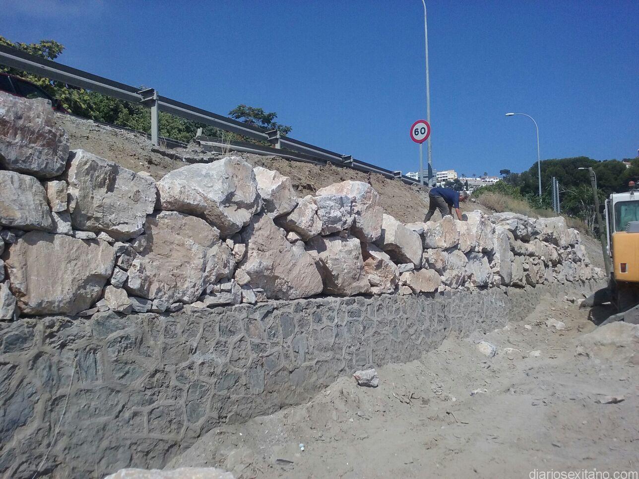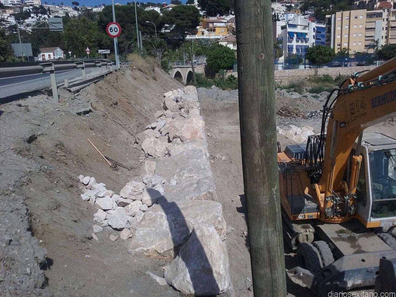 El Ayuntamiento sexitano pretende construir una acera que sirva de acceso por la Carretera Nacional 340 a las urbanizaciones situadas en Los Pinos y la Avenida Príncipe de Asturias, entre otras. Con esta finalidad, estos días lleva a cabo la construcción de una escollera para ampliar el talud de la CN 340 junto al solar del aparcamiento de camiones.
