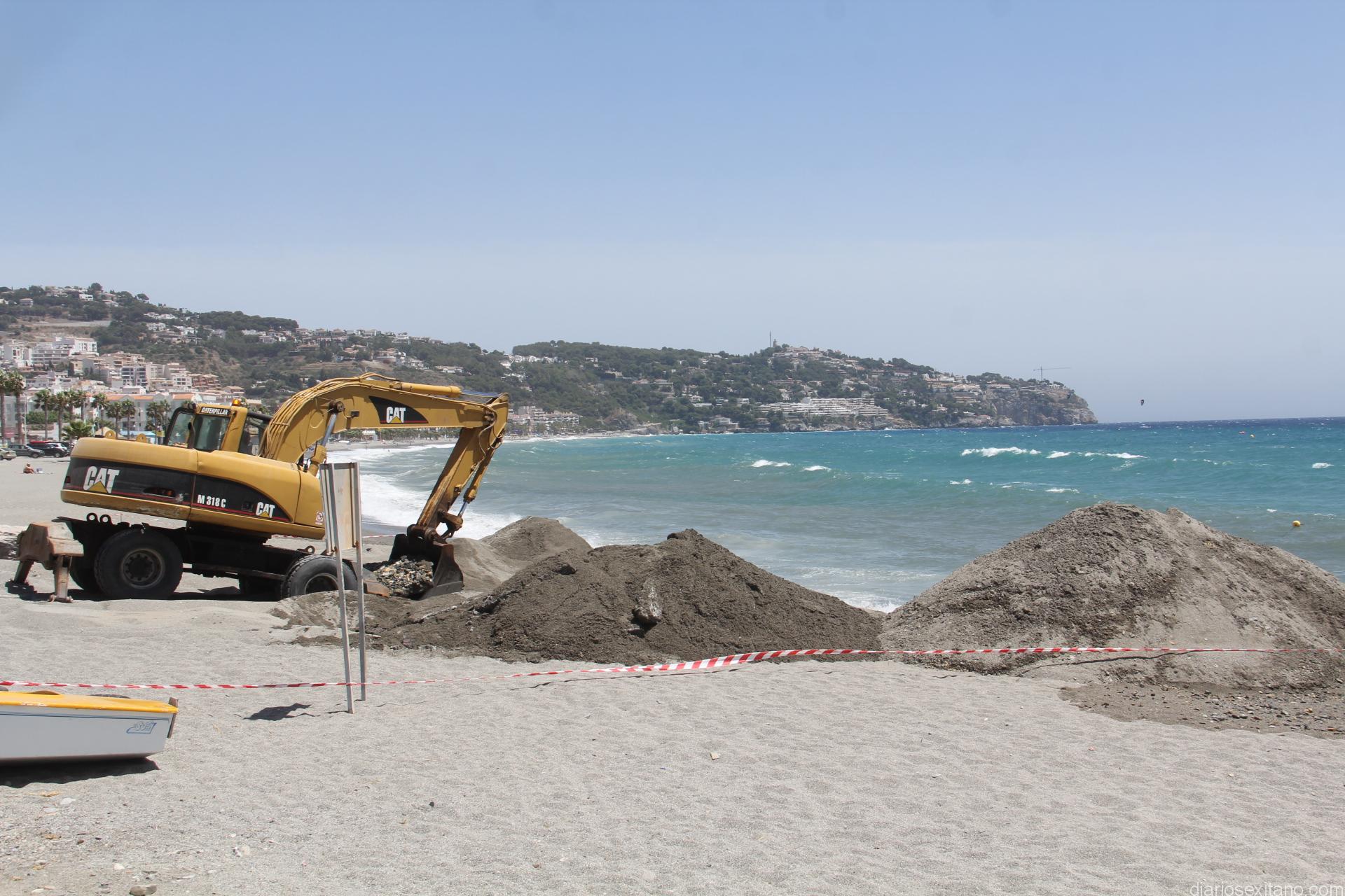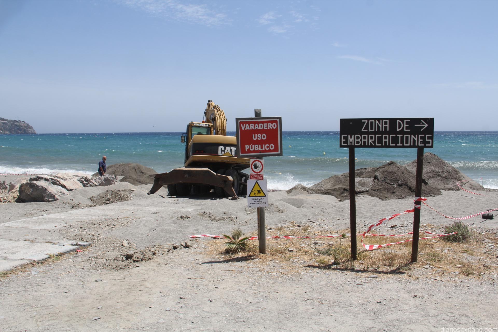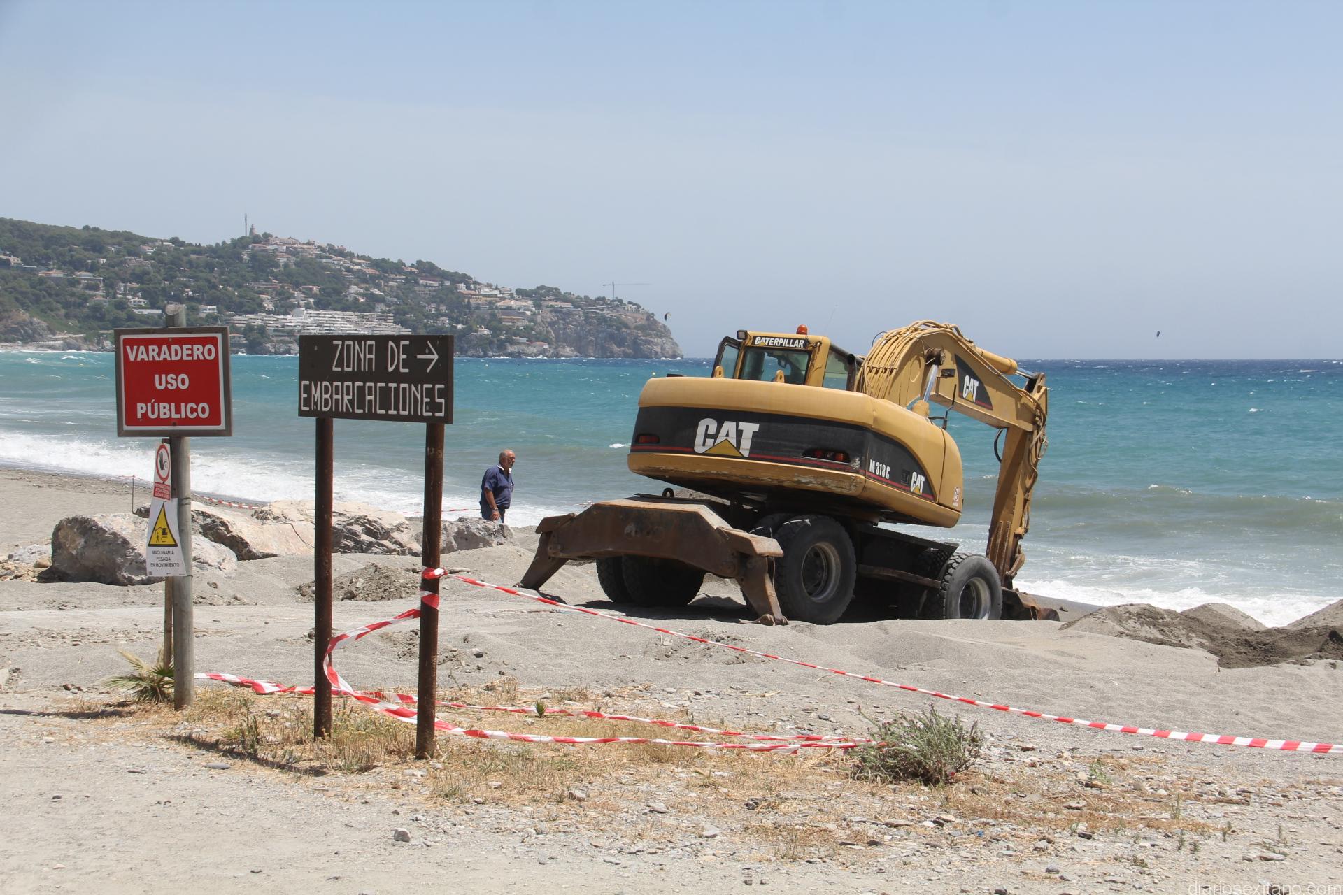 Las máquinas de Costas han vuelto esta semana a la playa de La Herradura para realizar dos obras pendientes: la construcción de una escollera para conformación de una rampa varadero de embarcaciones y la instalación de bolardos de madera para cerrar la playa al estacionamiento de vehículos, dejando espacio de unos tres metros para estacionamiento en batería o en línea, donde no de la medida.
