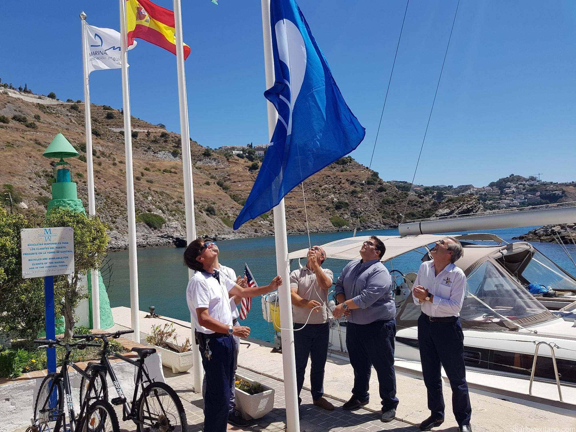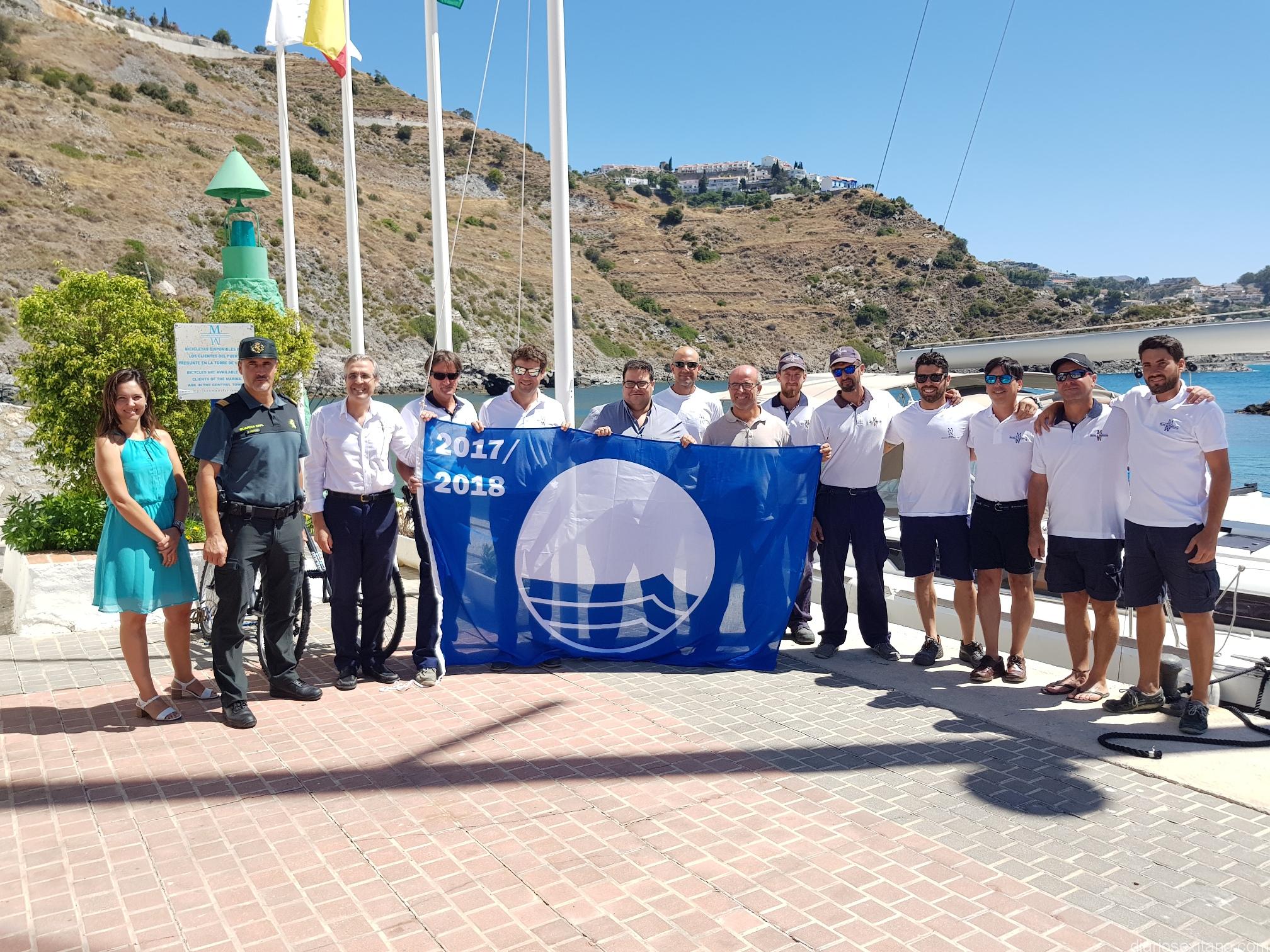 Un año más luce ya en la bocana del Puerto Deportivo “Marina del Este”, situado en el municipio sexitano, la vigesimotercera Bandera Azul. El acto oficial de izado del galardón medioambiental estuvo presidido por director gerente del grupo Marinas del Mediterráneo, concesionario del mismo, Manuel Raigón, junto con los ediles de Medio Ambiente y Turismo en el Consistorio sexitano, Luis Aragón y Rafael Caballero, respectivamente. Tampoco quisieron faltar a tan destacado e importante acto; el jefe de Mantenimiento del puerto Marina del Este, junto el representante de la Guardia Civil y la mayoría de los marineros que prestan servicio este verano en el mismo.