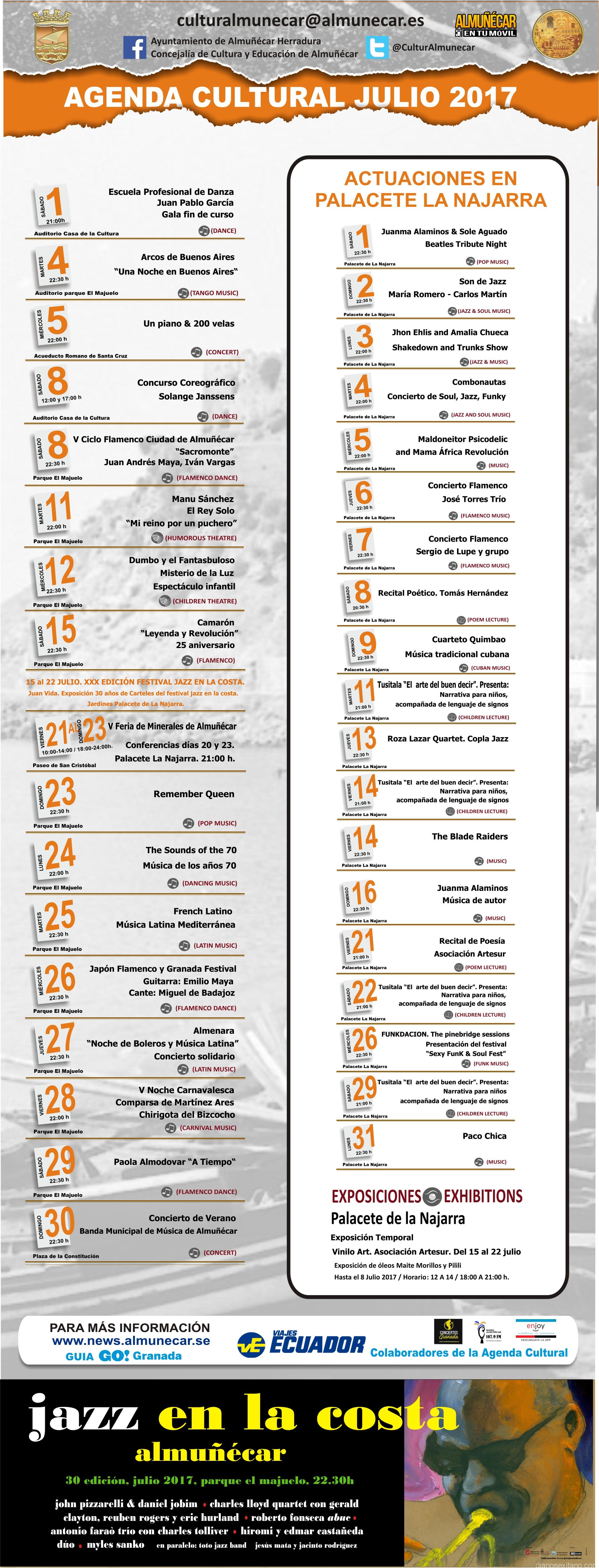 A lo largo del mes que comienza destaca el Festival de Jazz en la Costa de Almuñécar, previsto del 15 al 22 de julio, que llega este año a su trigésima edición con destacadas actuaciones en un marco único como es el Parque botánico arqueológico “El Majuelo”.