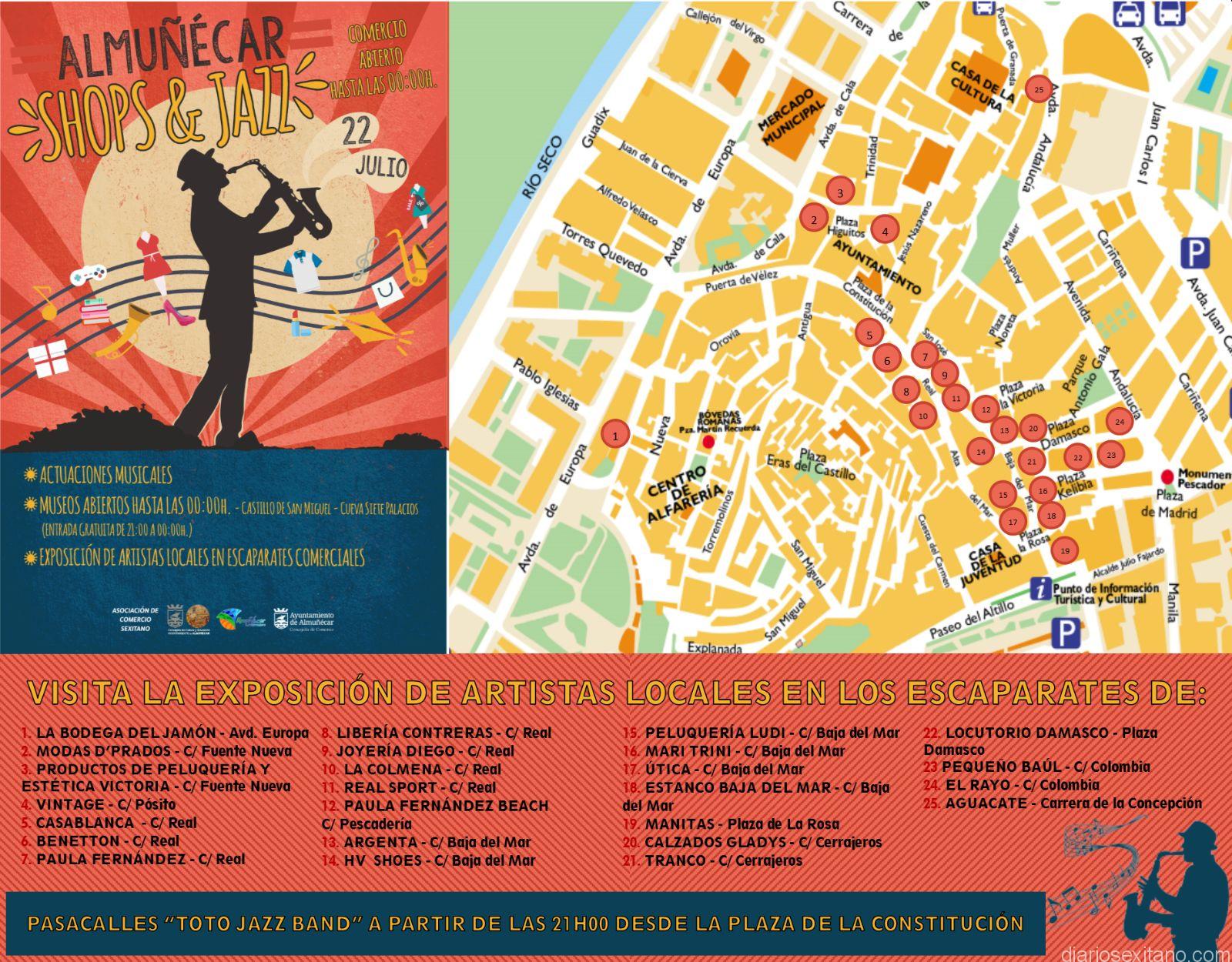 La Asociación de Comercio Sexitano aprovecha el ambiente del Festival de Jazz que vive Almuñécar esta semana y animará el sector con una iniciativa denominada Shops & Jazz que mantendrá los establecimientos abiertos hasta la media noche este próximo sábado día 22, según recordaron los responsables del gremio, encabezados por el presidente del Germán Ureña y el concejal delegado municipal de Comercio, Rafael Caballero Jiménez.