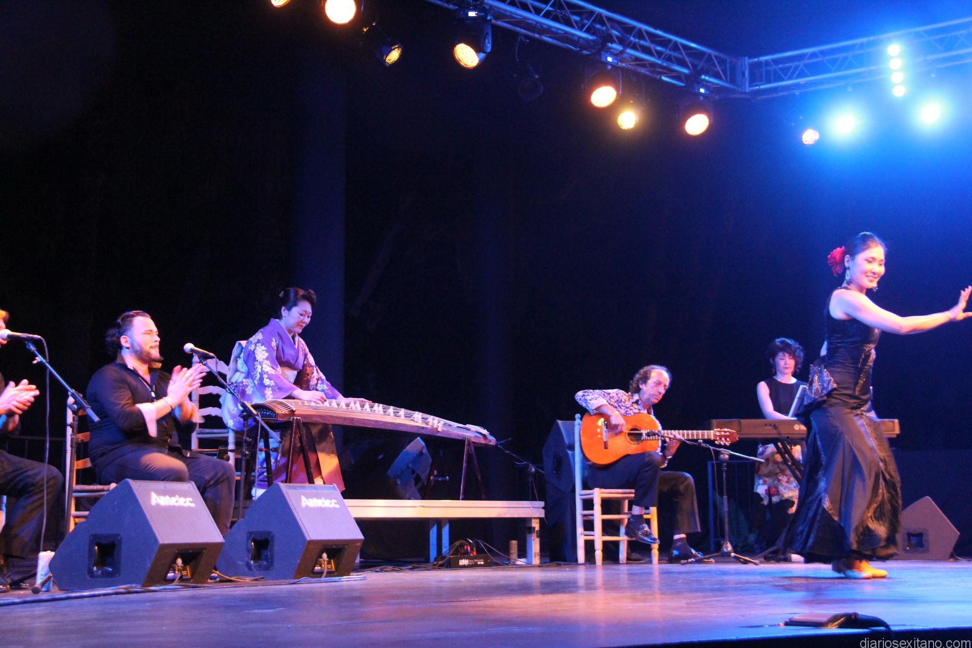 Yoshimi Uchida, Kotoja Setoguchi, Keiko Ishikawa, Shiho Tokuda, Ariko Yara, Yumiko Sato, Yuka Une y Trinity fueron protagonistas demostraron sus dotes aventajados de auténticas bailaoras. El espectáculo, que reunió a casi medio millar de personas y contó con la colaboración de la Concejalía de Cultura del Consistorio sexitano, contó con la participación de instrumentos japoneses que combinaron con el cante de Manuel Tane y la guitarra de Emilio Maya, entre otros.