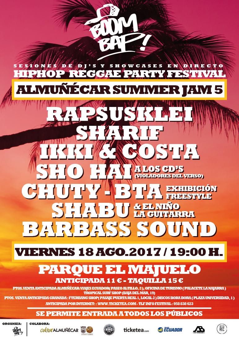 Rapsusklei, Sharif, Ikki & Costa, Sho hai (Violadores del Verso), Chuty – BTA, Shabu &El Niño de la guitarra y Barbass Sound son los componentes del cartel del V Festival Almuñécar Summer Jam que acogerá la ciudad sexitana en lo que está considerado como el mejor evento de hiphop y reggae de la Costa Tropical de Granada y uno de los más destacados de Andalucía.