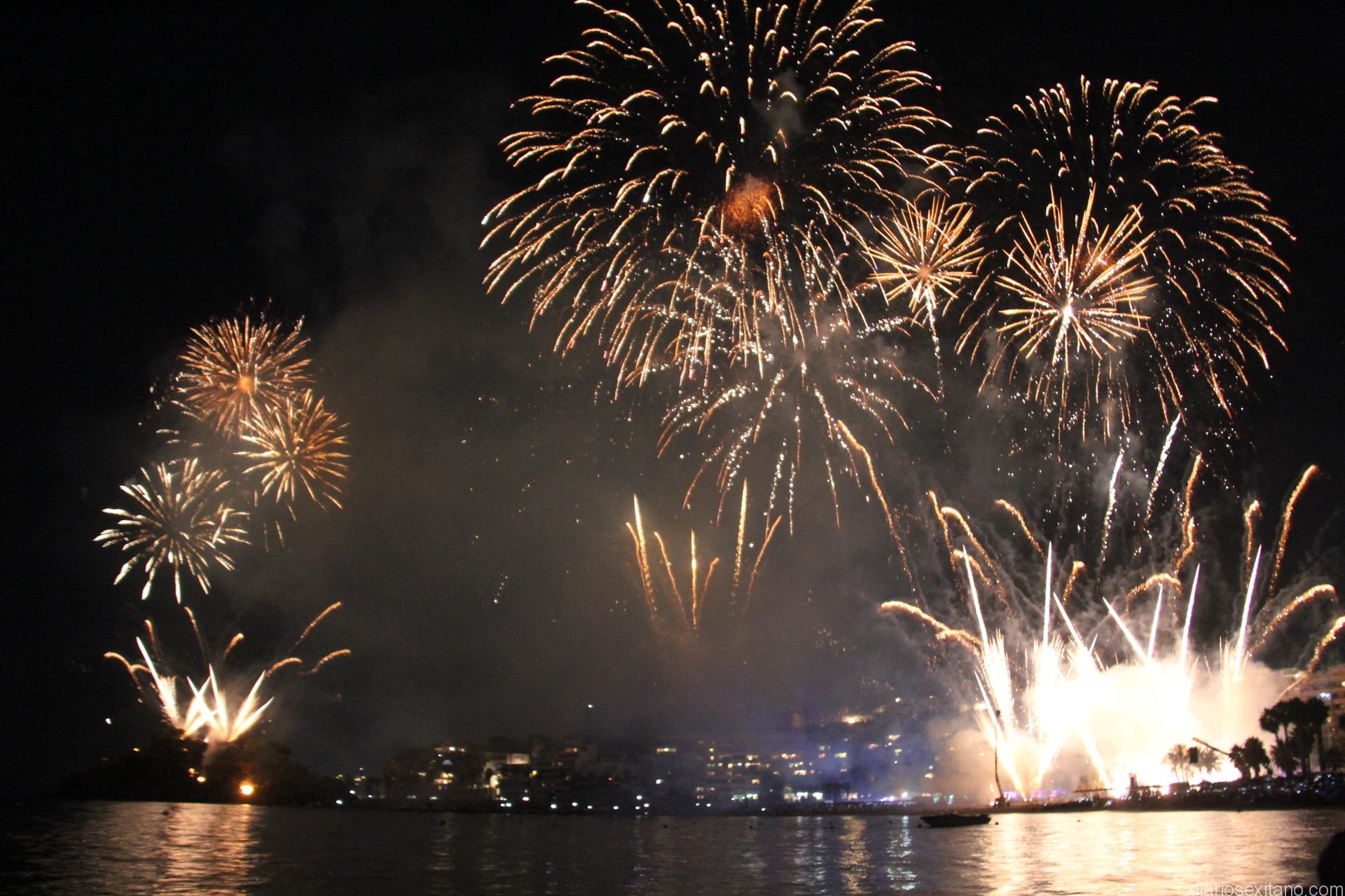El espectáculo dará comienzo sobre las 23,15 horas, aproximadamente. Será aproximado porque comienza cuando la barca de la Virgen de la Antigua, que portará a la Patrona de Almuñécar haya superado los Peñones del Santo rumbo a la playa Puerta del Mar, tras ser embarcada en la playa de San Cristóbal, cumpliendo así la tradición y si el estado de la mar lo permite.