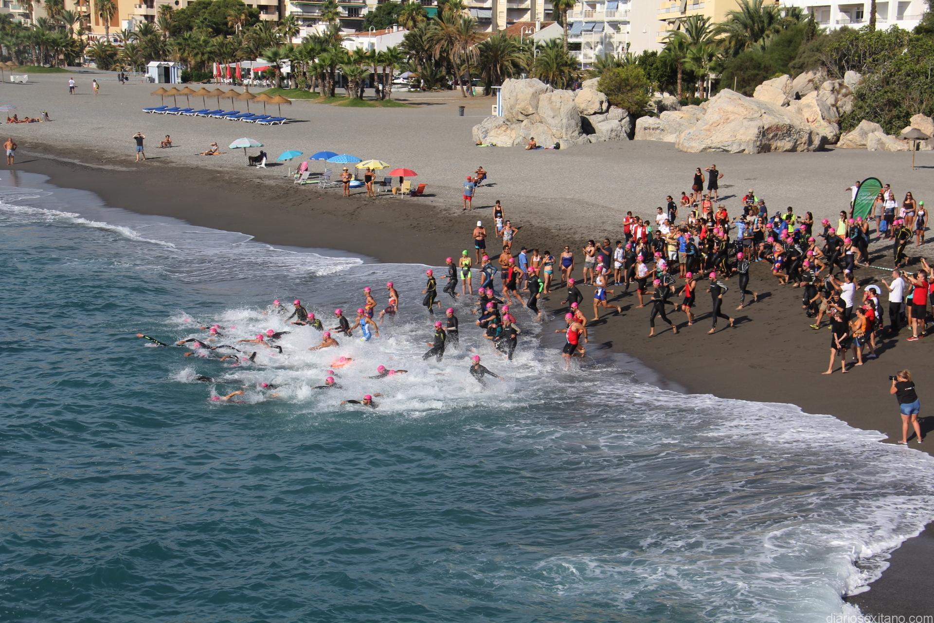Arrancó con la prueba de natación donde los participantes tuvieron que completar una distancia de 1000 metros, desde las aguas de la playa del Tesorillo hasta la playa El Pozuelo, junto a la cual se ubicó la zona de transacción.