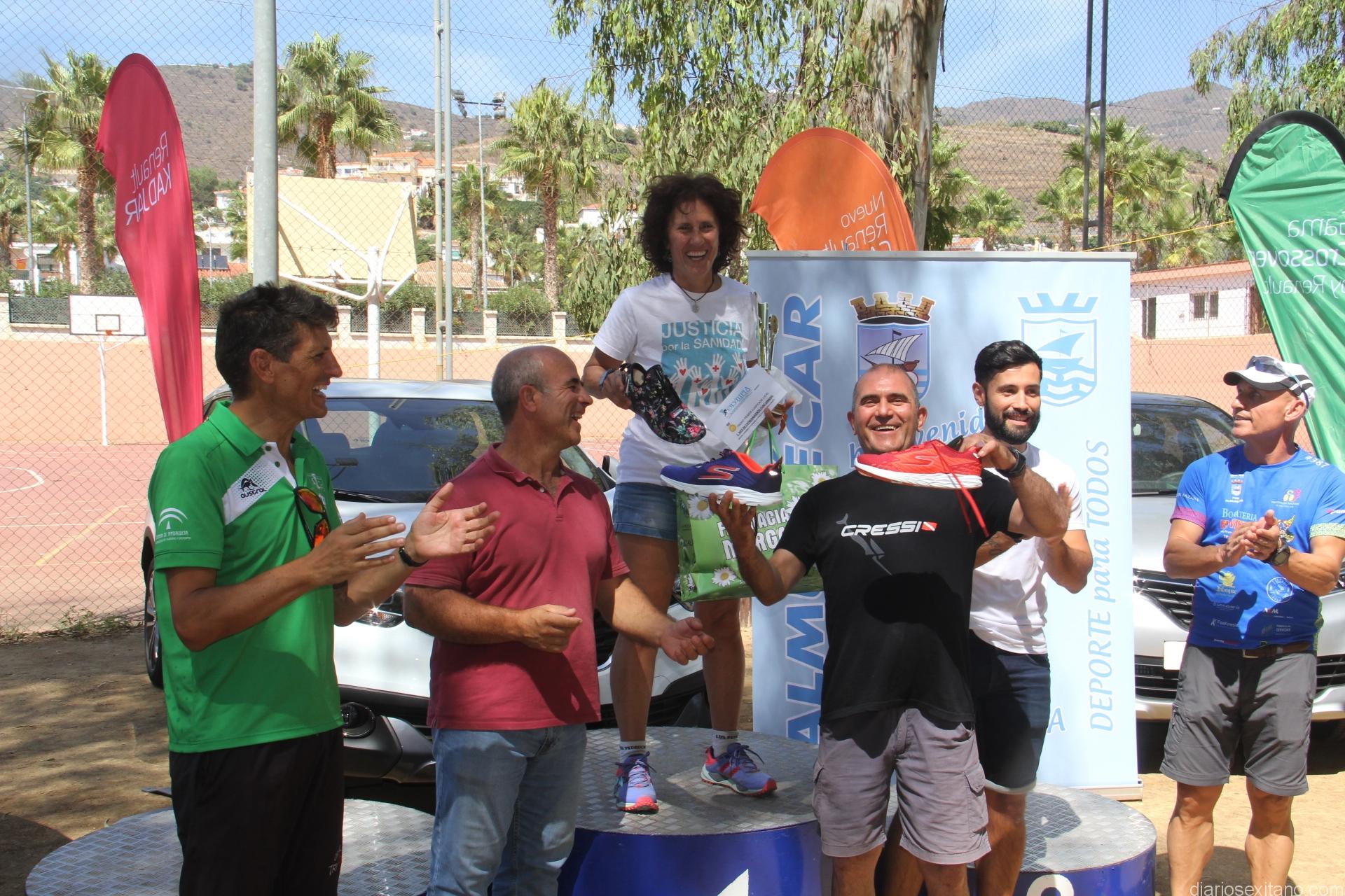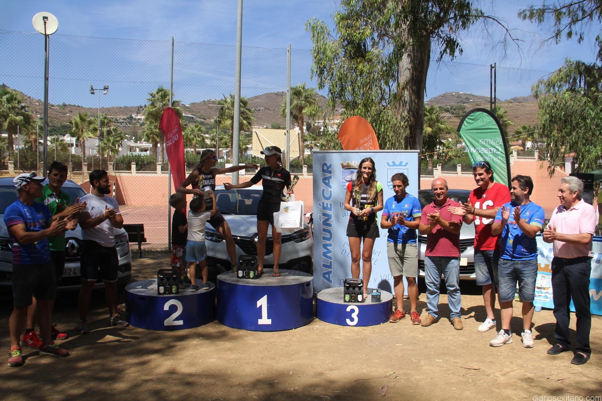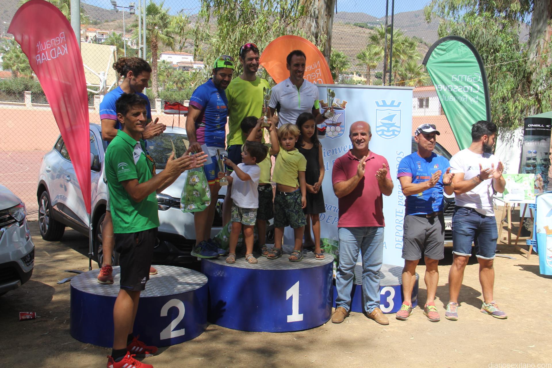 Antes de entrega de premios a las distintas categorías masculina y femenina, el organizador y representante del Club Triatlón Nazarí de Almuñécar, Álvaro Manzano, junto con el concejal de Deportes, Luis Aragón, hicieron entrega de una placa a los padres y hermana del desaparecido deportista sexitano Javi Rubiño y para lo cual la prueba llevaba el número de éste #387.