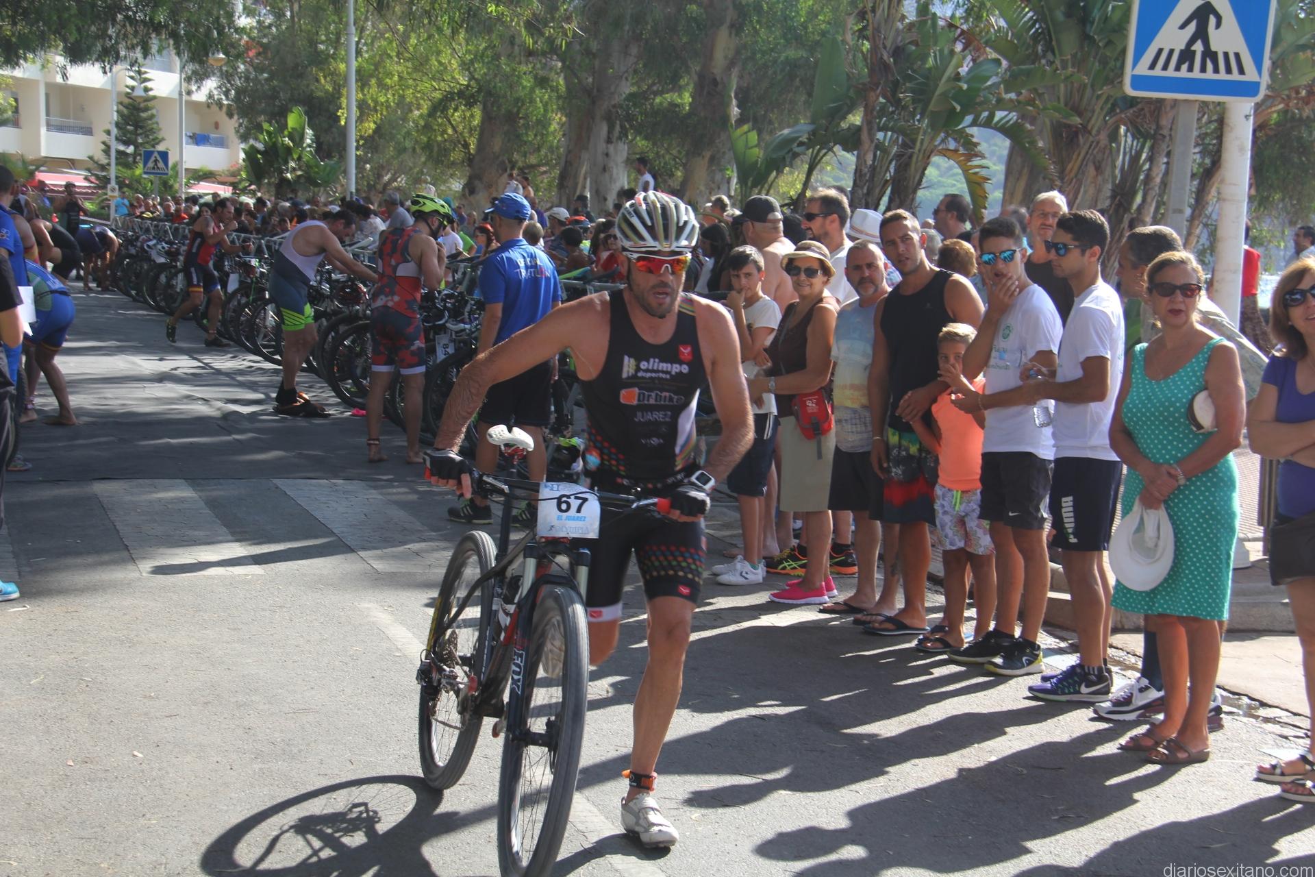 Después llegaría el recorrido de 20 Km con bicicleta de montaña, con un temperatura ambiente 25 grados, que transcurrió por pistas y un pequeño tramo de senda que llevó a los participantes hasta alcanzar la zona del Cerro de Ítrabo superando un importante desnivel. El primero en cubrir este recorrido fue el malagueño del CD Triatlón Atletismo Torremolinos, José Julián Barón Yuste, con un tiempo de 55 minutos y 4 segundos.