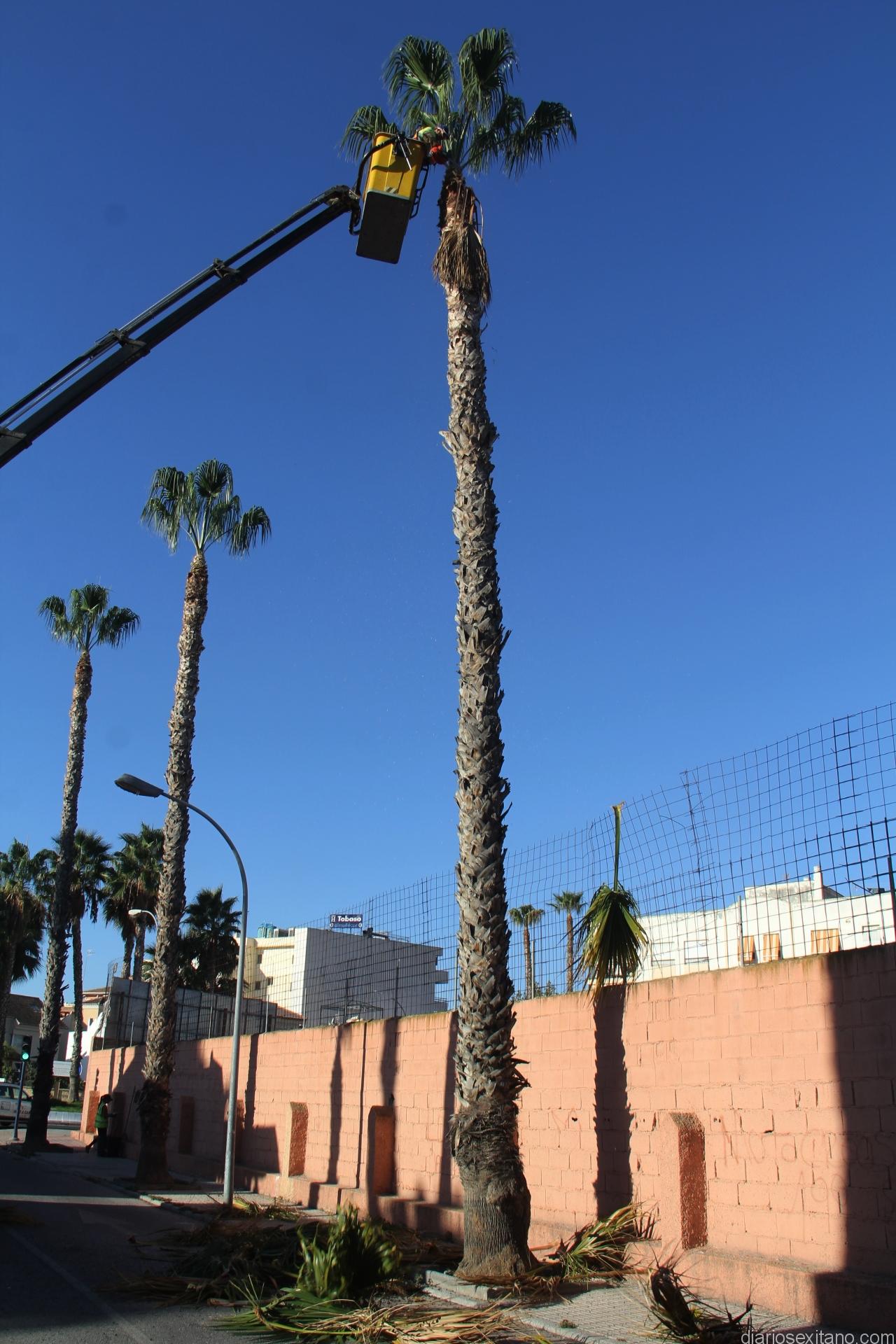 El pasado mes de septiembre arrancaba una primera fase de limpieza de palmeras en la zona Las Góndolas y en dirección, por el paseo Reina Sofía, hacía Velilla contando para ello con el apoyo externo de la empresa FCC.
