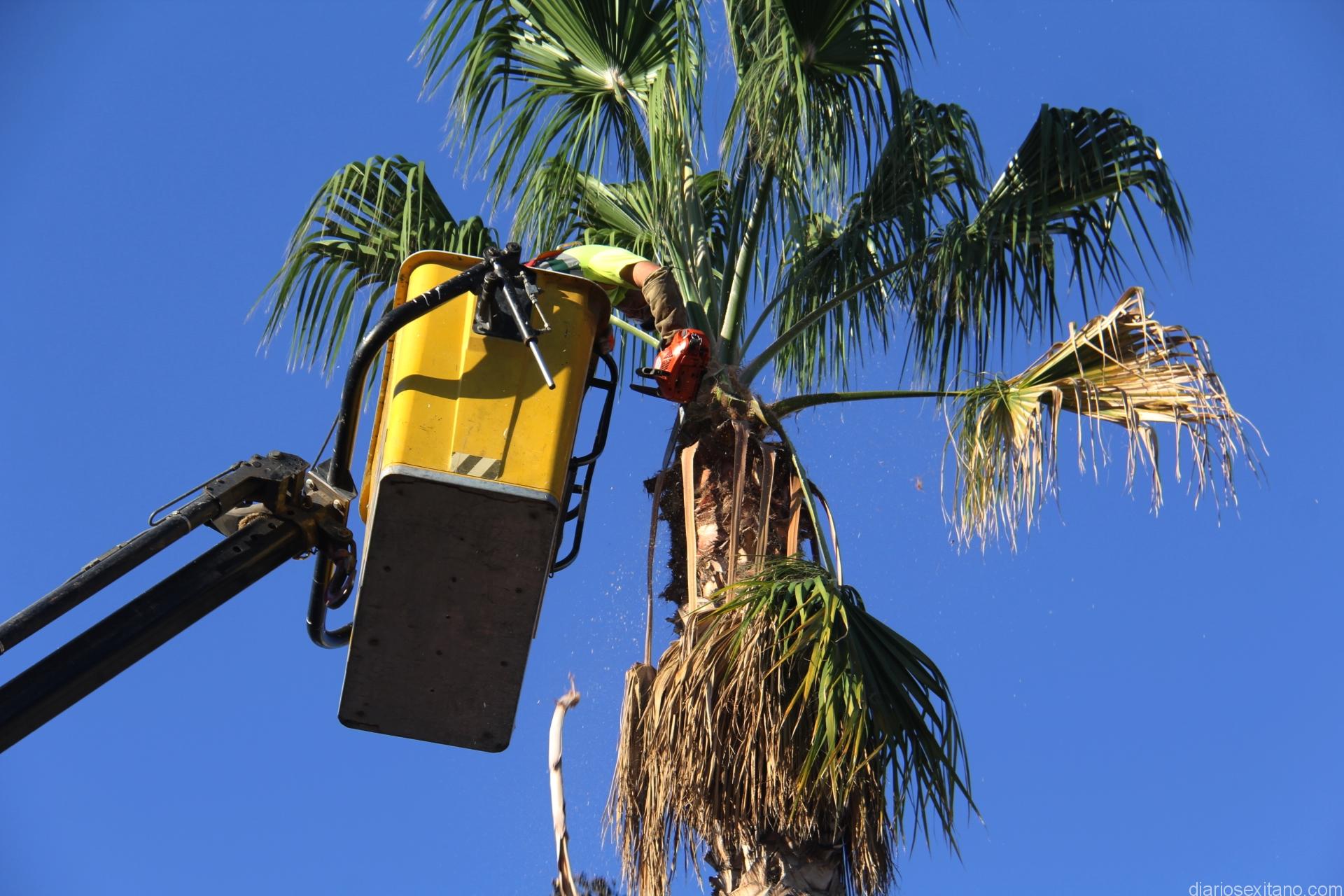 El Ayuntamiento de Almuñécar lleva a cabo a través de operarios el Servicio de Jardinería la limpieza de palmeras en el centro urbano.