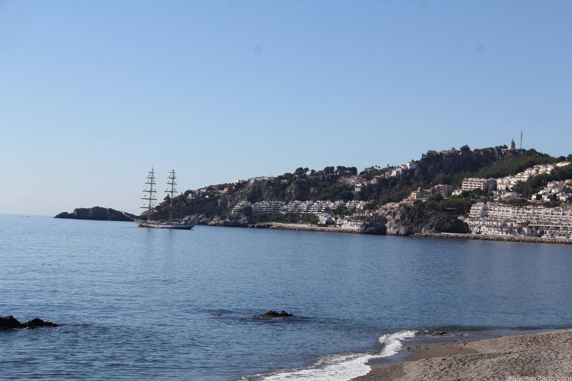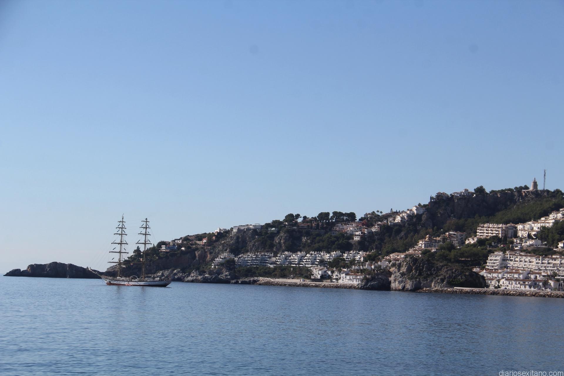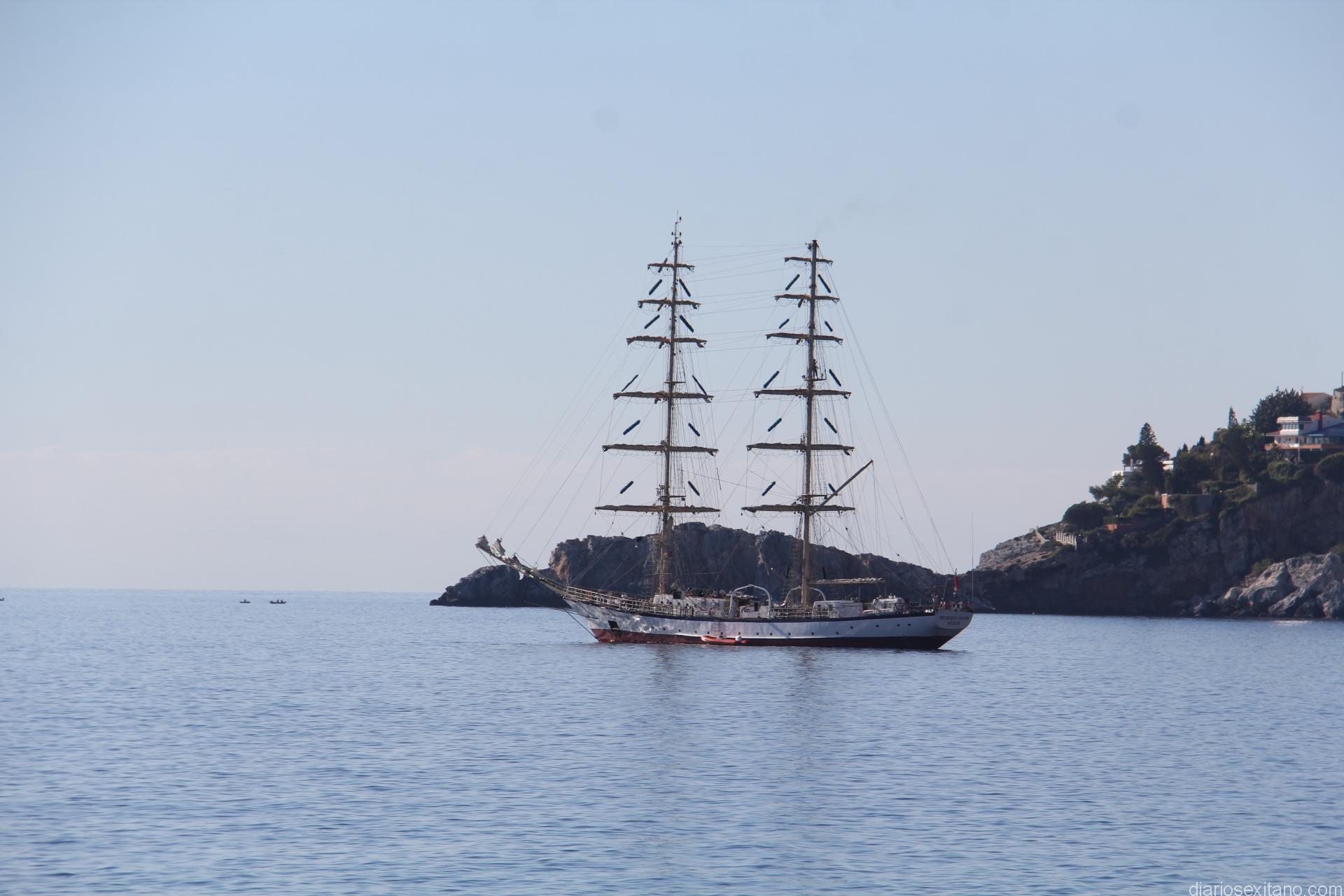 Los vecinos de la zona de Marina del Este y Cotobro así como todos los sexitanos que se acercan por la zona pueden ver hoy una bella estampa marinera con la visita de un bonito barco velero bergantín en la bahía de El Berenguel, frente al puerto deportivo Marina del Este.