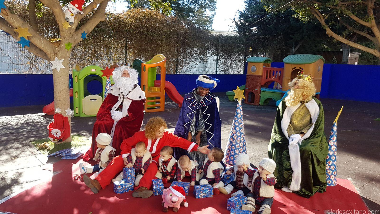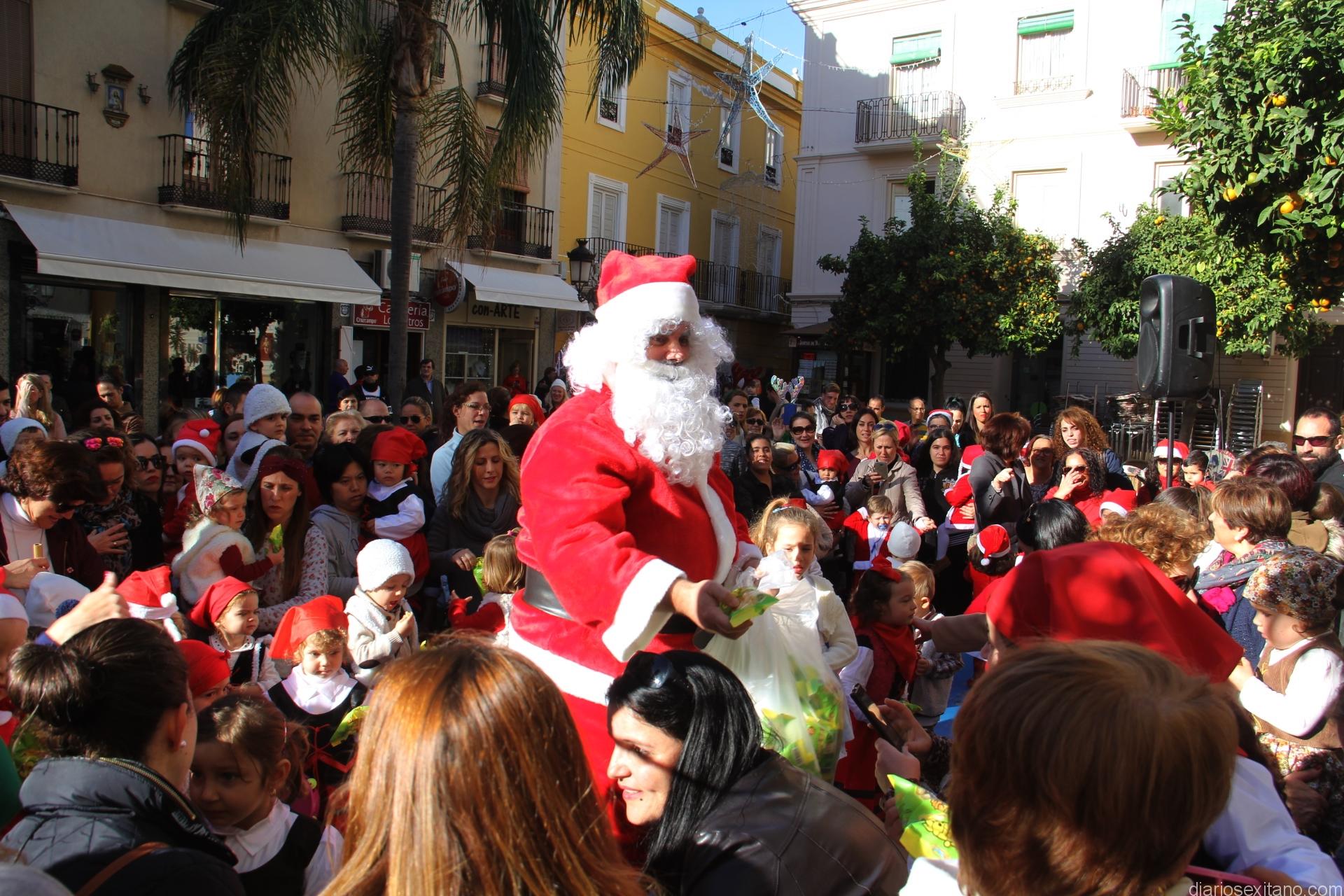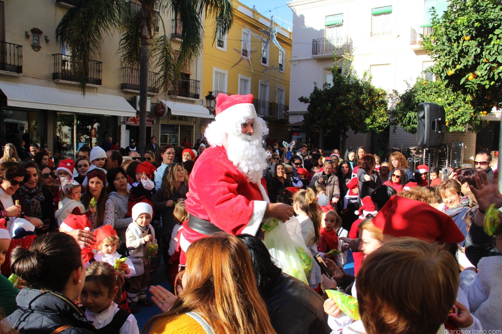 La plaza de la Constitución de Almuñécar se llenó esta mañana de pastores y pastorcillas sexitanas que, procedentes de los centros infantiles de Almuñécar, aguardaron con cánticos y bailes la llegada de Papa Noel que apareció con un gran saco de regalos de productos más que deseados por los pequeños.