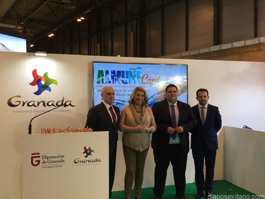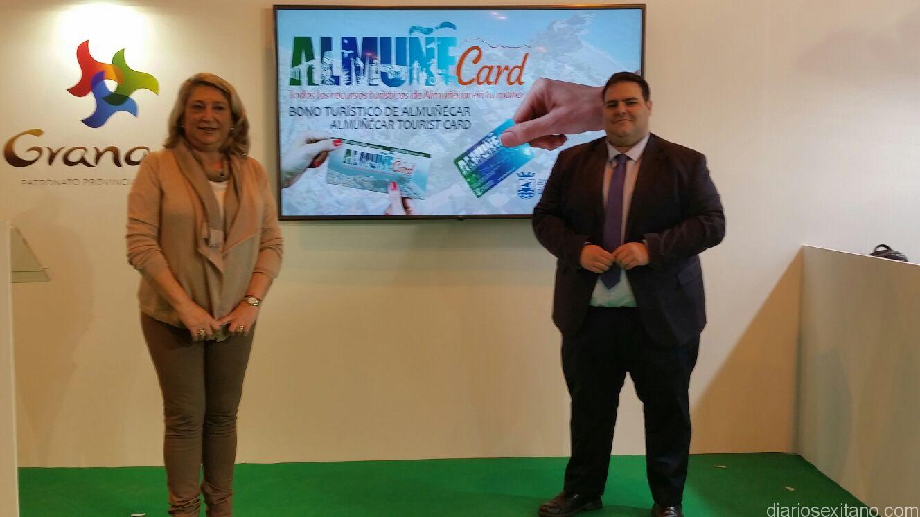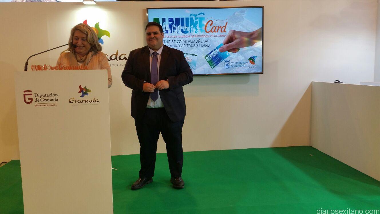aldesa y presidenta del Patronato Municipal de Turismo de Almuñécar, Trinidad Herrera Lorente, y el concejal delegado de Turismo, Rafael Caballero Jiménez han iniciado la agenda de actividades en la Feria Internacional de Turismo de Madrid (Fitur 2018) con la presentación de del Bono Turístico de Almuñécar que bajo el nombre “AlmuñeCard” pondrá este año en marcha el Ente Turístico sexitano.