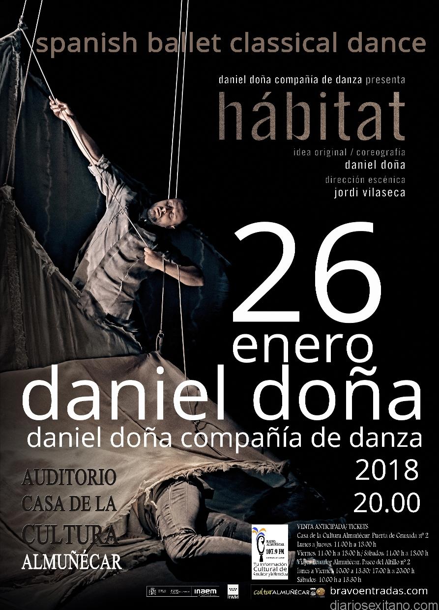 El coreógrafo y bailarín Daniel Doña presentará el próximo viernes 26 de enero, a las 20 horas, en la Casa de Cultura de Almuñécar (C/Puerta de Granada, 19), su espectáculo Hábitat, que fue galardonado con el Premio El Ojo Crítico de Danza 2016 y con el que abrió la pasada edición del Festival Internacional Madrid en Danza en los Teatros del Canal. Sobre el escenario, bajo la dirección escénica de Jordi Vilaseca, el artista granadino estará acompañado por el bailarín Cristian Martín y por los músicos Alfredo Valero y David Vázquez, quienes junto a Héctor González son los creadores de la composición musical original de Hábitat. Las entradas, que ya están a la venta, tienen un precio único de 15 euros.