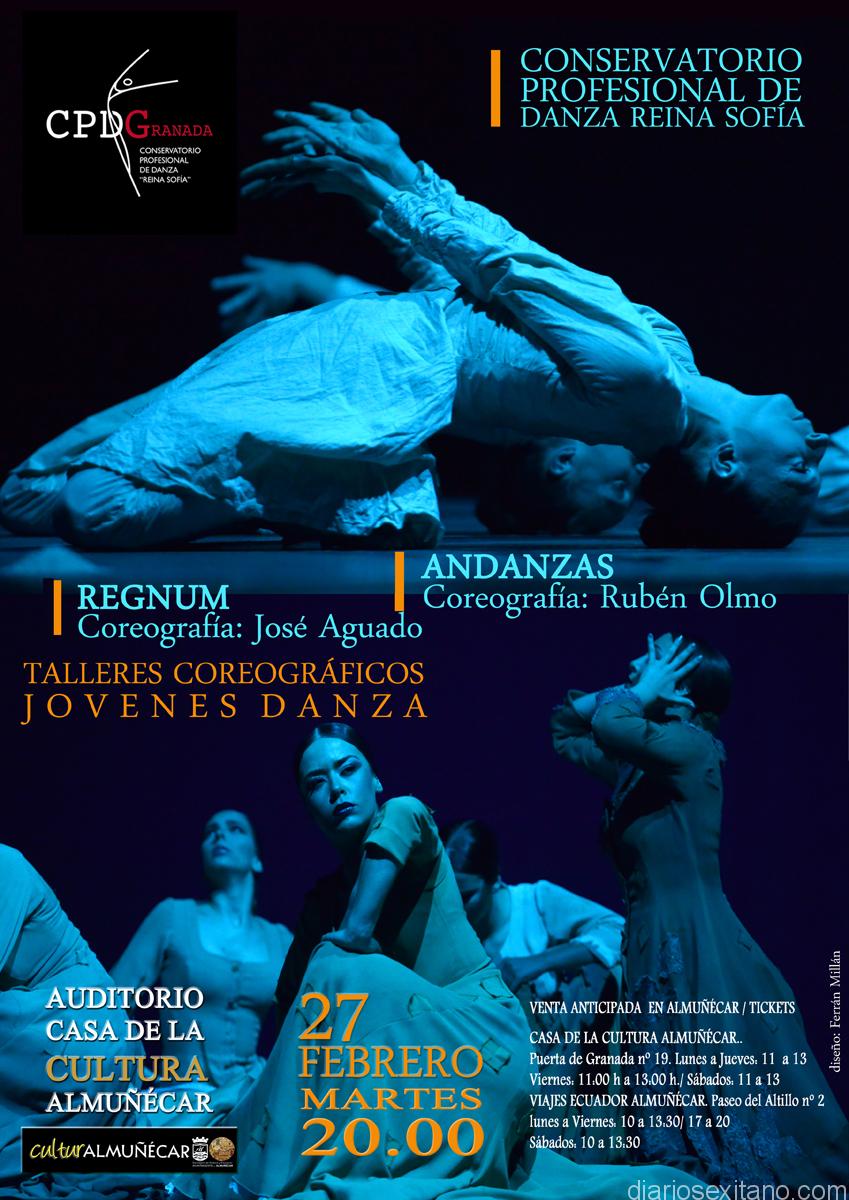 En la recta final de febrero y más en concreto el día 27, a las 20 horas, se presentará de nuevo en Almuñécar el Conservatorio Profesional de Danza de Granada “Reina Sofía” con Talleres Coreográficos jóvenes danza” . Regnum, con la coreografía de José Aguado y Andanzas con la de Rubén Olmo.