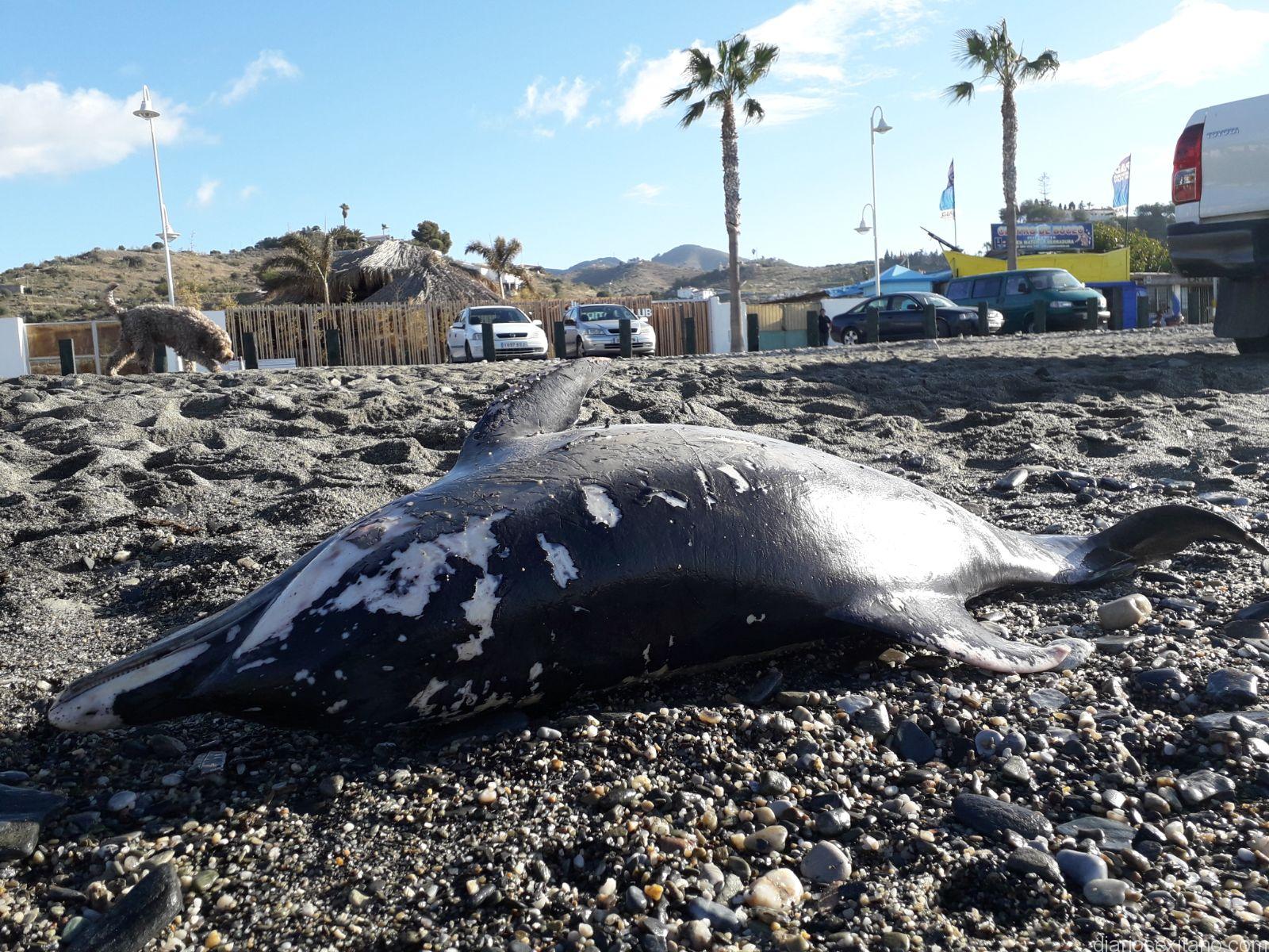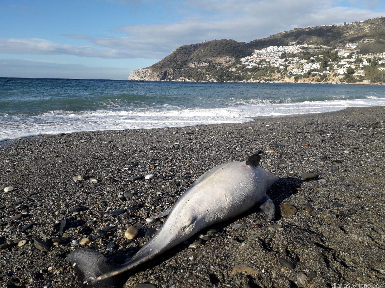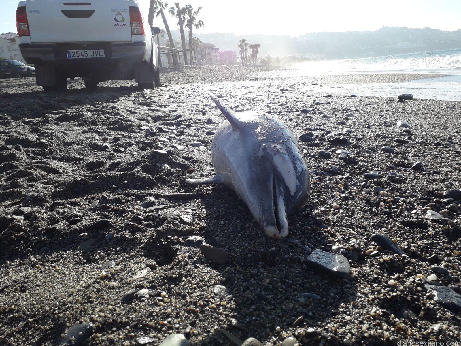 Un delfín de la variedad listado, hembra de 25 kg de peso y casi un metro de largo ha ha sido hallado muerto en la playa de La Herradura, en Almuñécar vecinos que alertaron a los operarios de la empresa de limpieza de las playas sexitanas, Urbaser.
