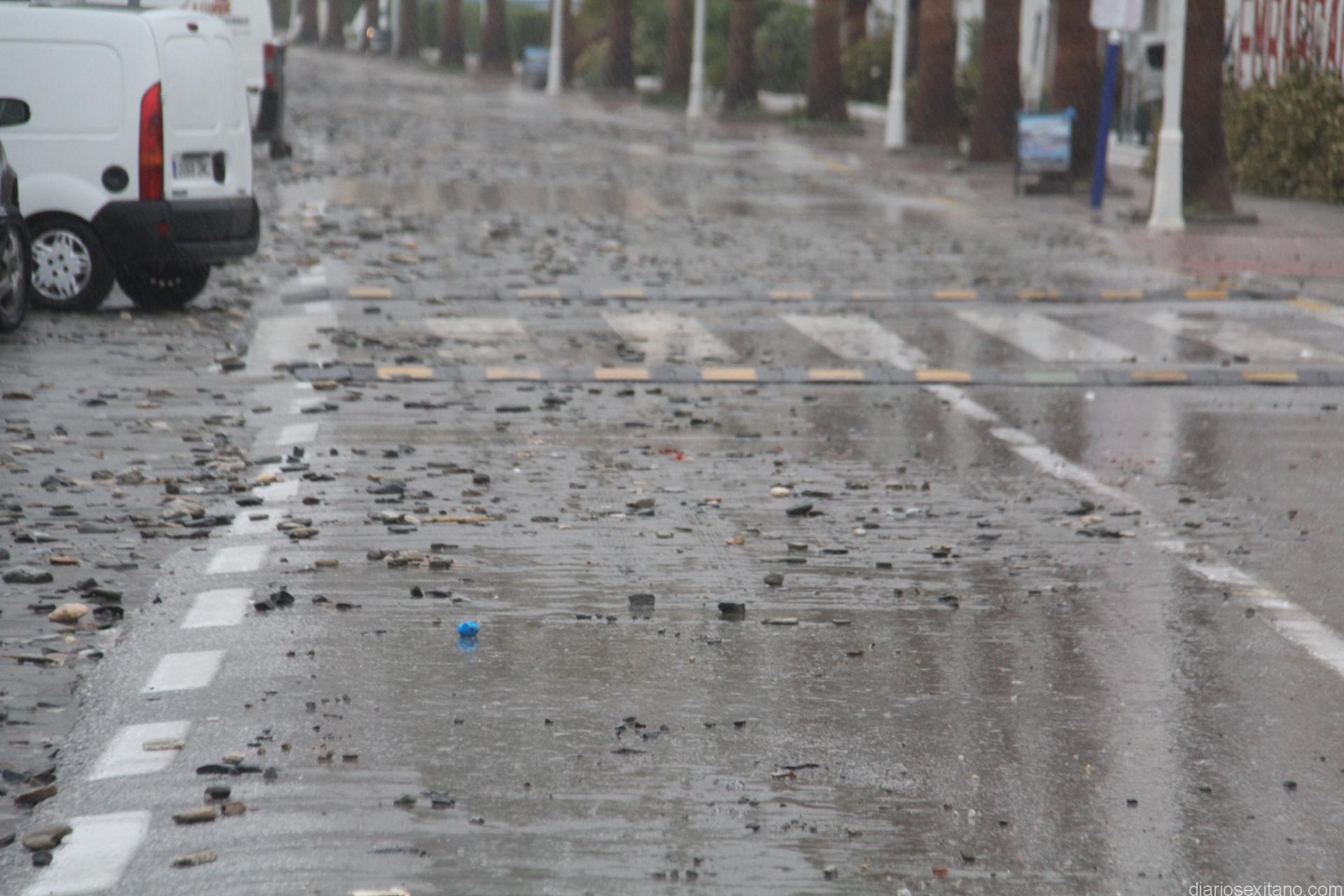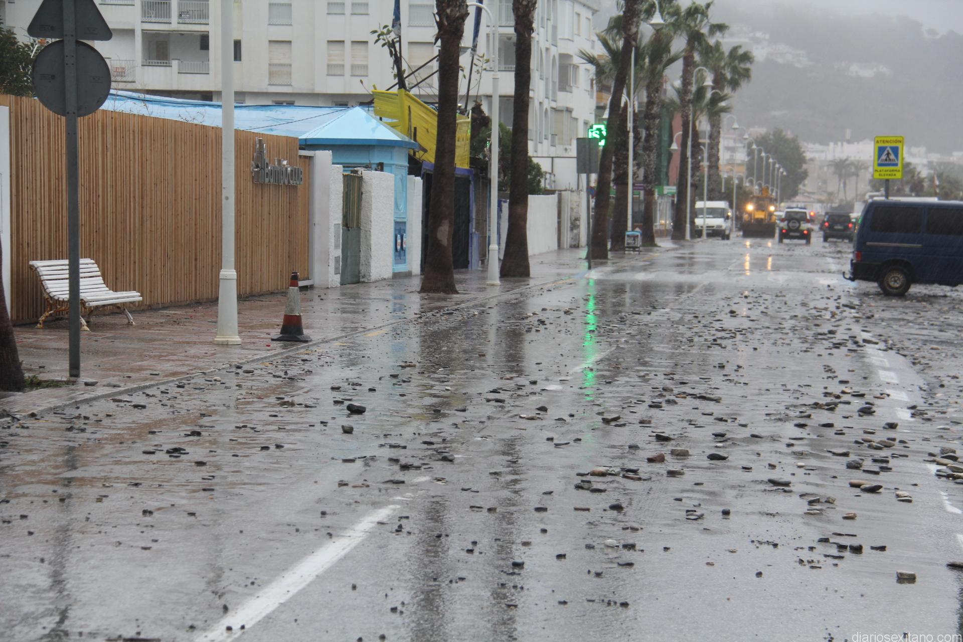 Los efectos del fuerte temporal de vendaval que desde primera hora de la tarde de ayer y hasta esta madrugada se han hecho visibles esta mañana en la playa de La Herradura con varias incidencias, siendo la más destacada el depósito de piedras sobre el vial de la playa herradureña.