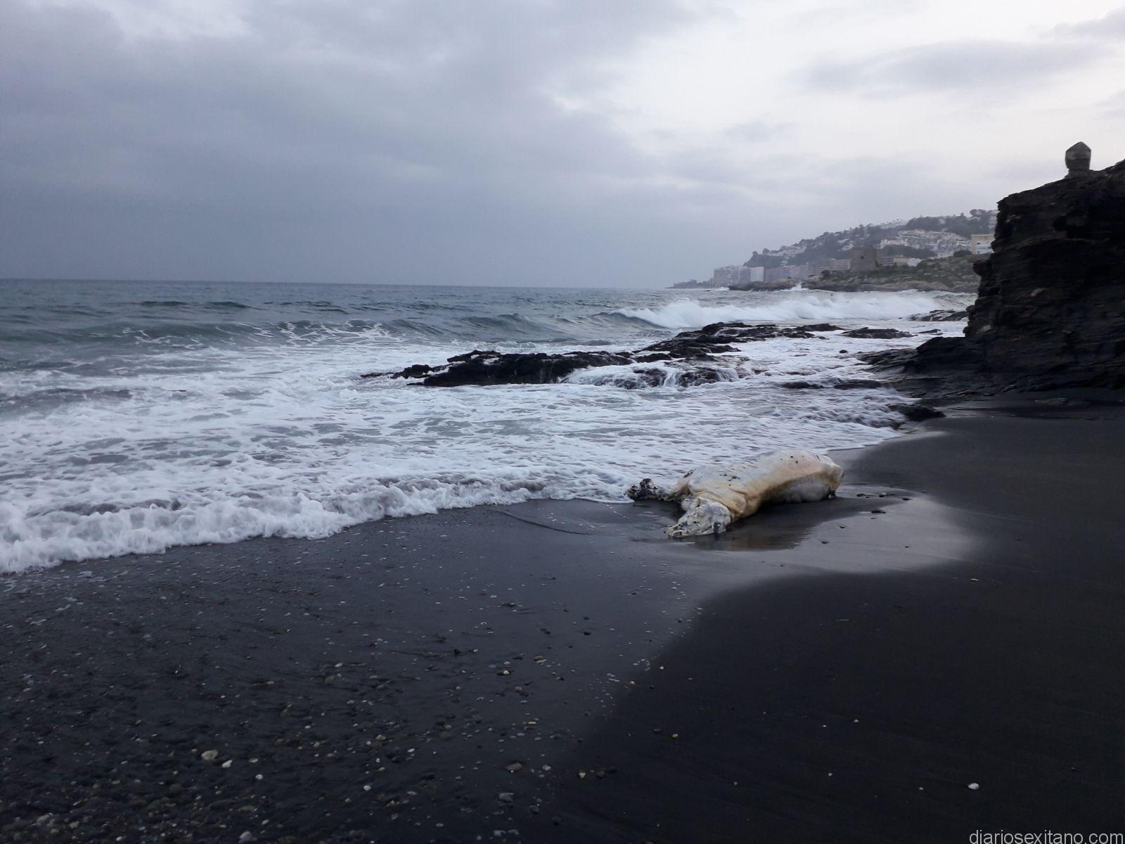 El animal, cuya identidad u origen se desconoce, fue depositado en la orilla tras el temporal de levante.