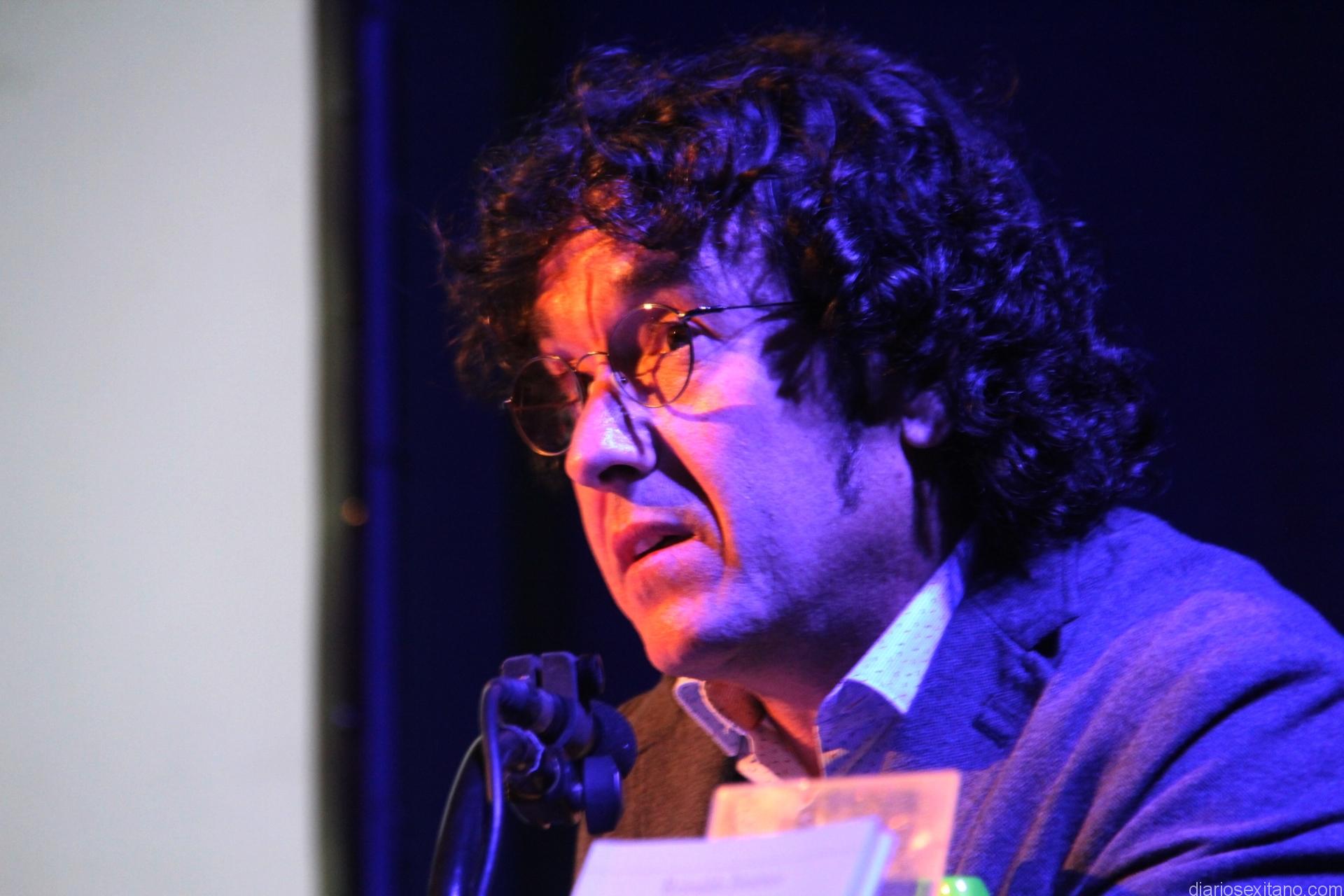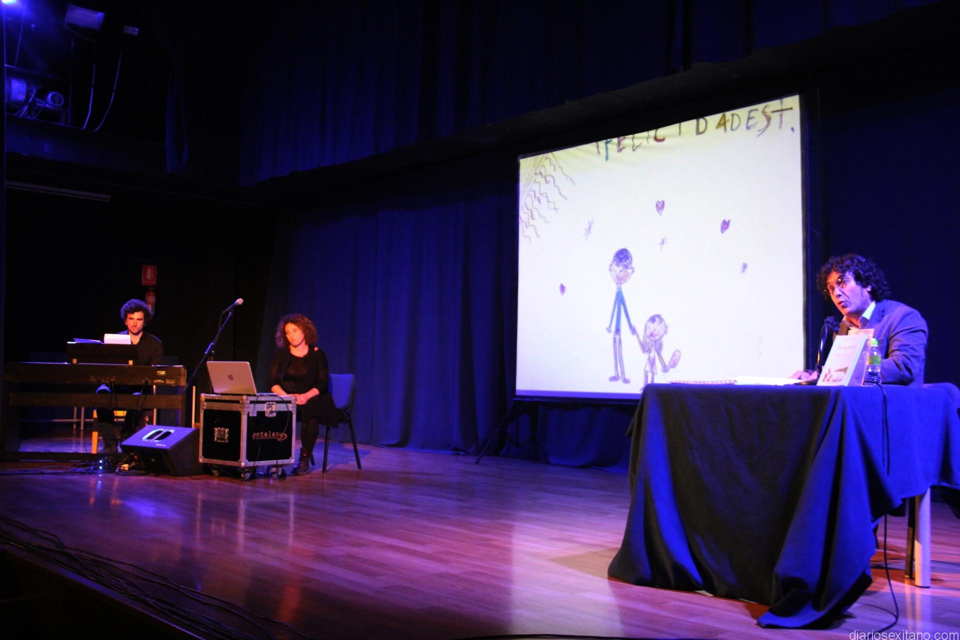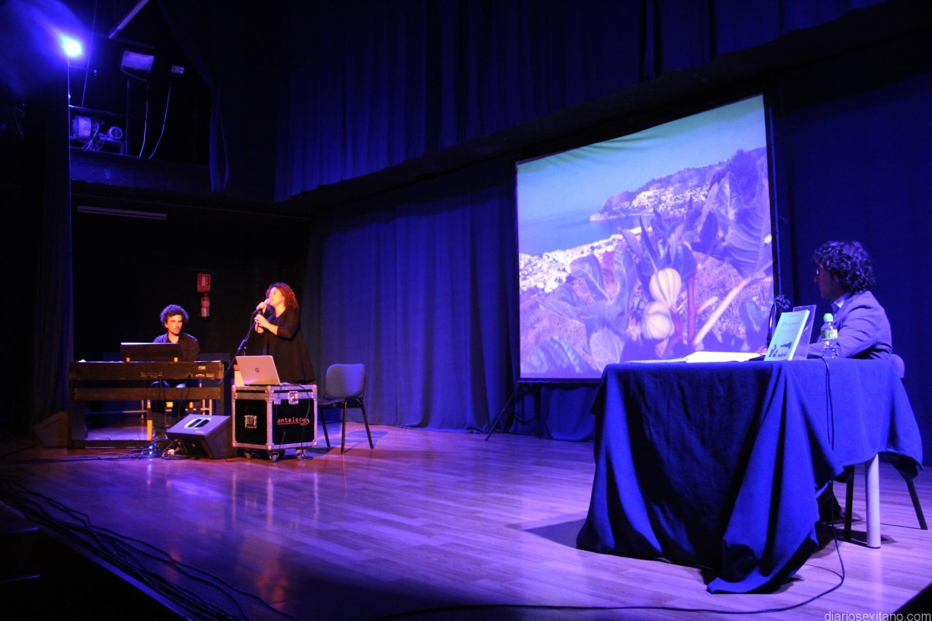 Reinaldo Jiménez estuvo acompañado en el escenario por la Anaví Fernández Naranjo y Pedro Hernández Arredondo, que pusieron voz y música a algunos de los trabajos del poeta herradureño, apoyados también en imágenes relacionadas con cada uno de los poemas.
