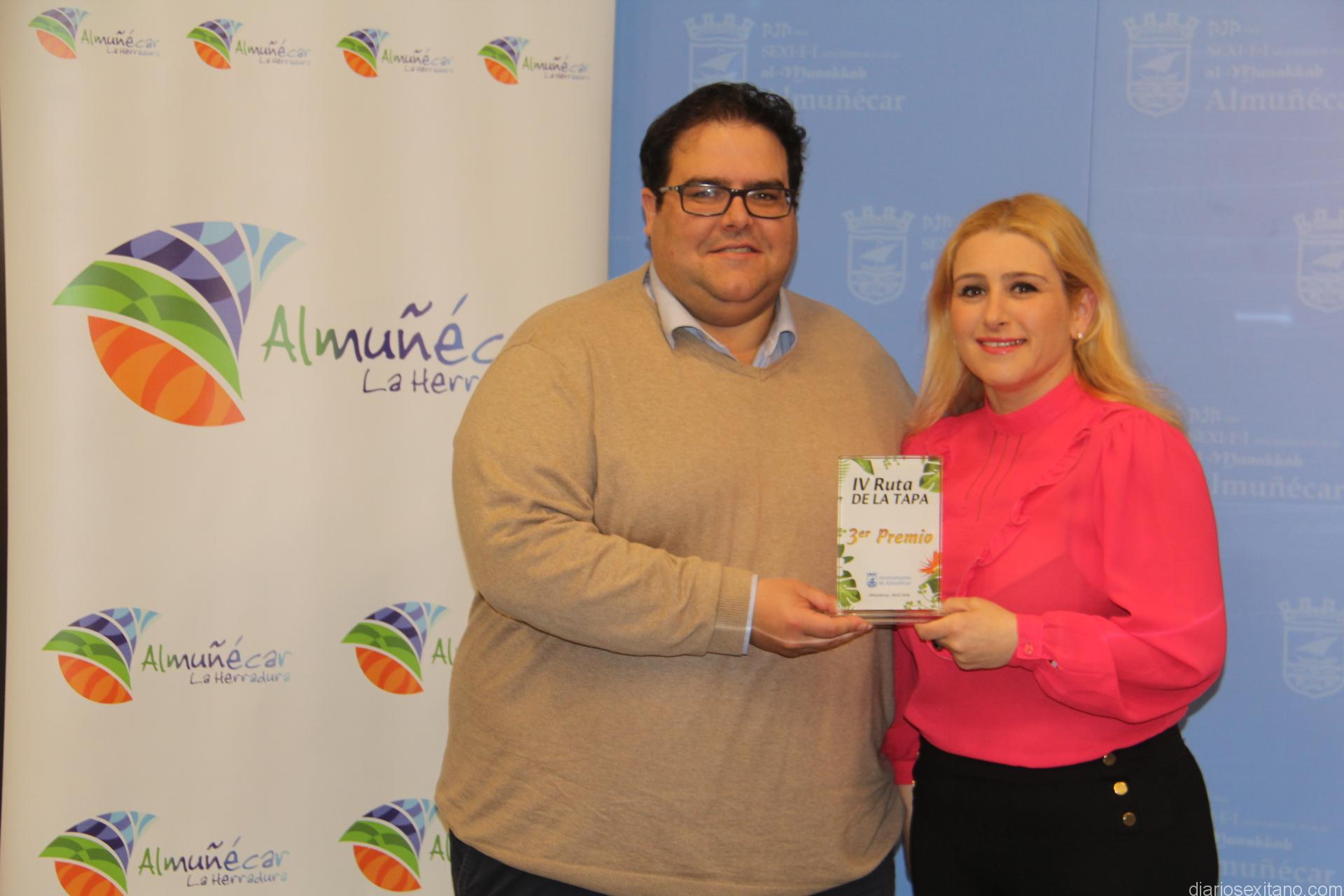 El concejal delegado de Turismo y Comercio, Rafael Caballero Jiménez, ha hecho entrega del tercer galardón de la IV Ruta de la Tapa de Almuñécar a Ceciia de la Flor, en nombre del establecimiento “De la Flor Gastrobar”, que preparó una tapa denominada: “canelón crujiente de carrillada ibérica, cebolla confitada, setas y mango”.