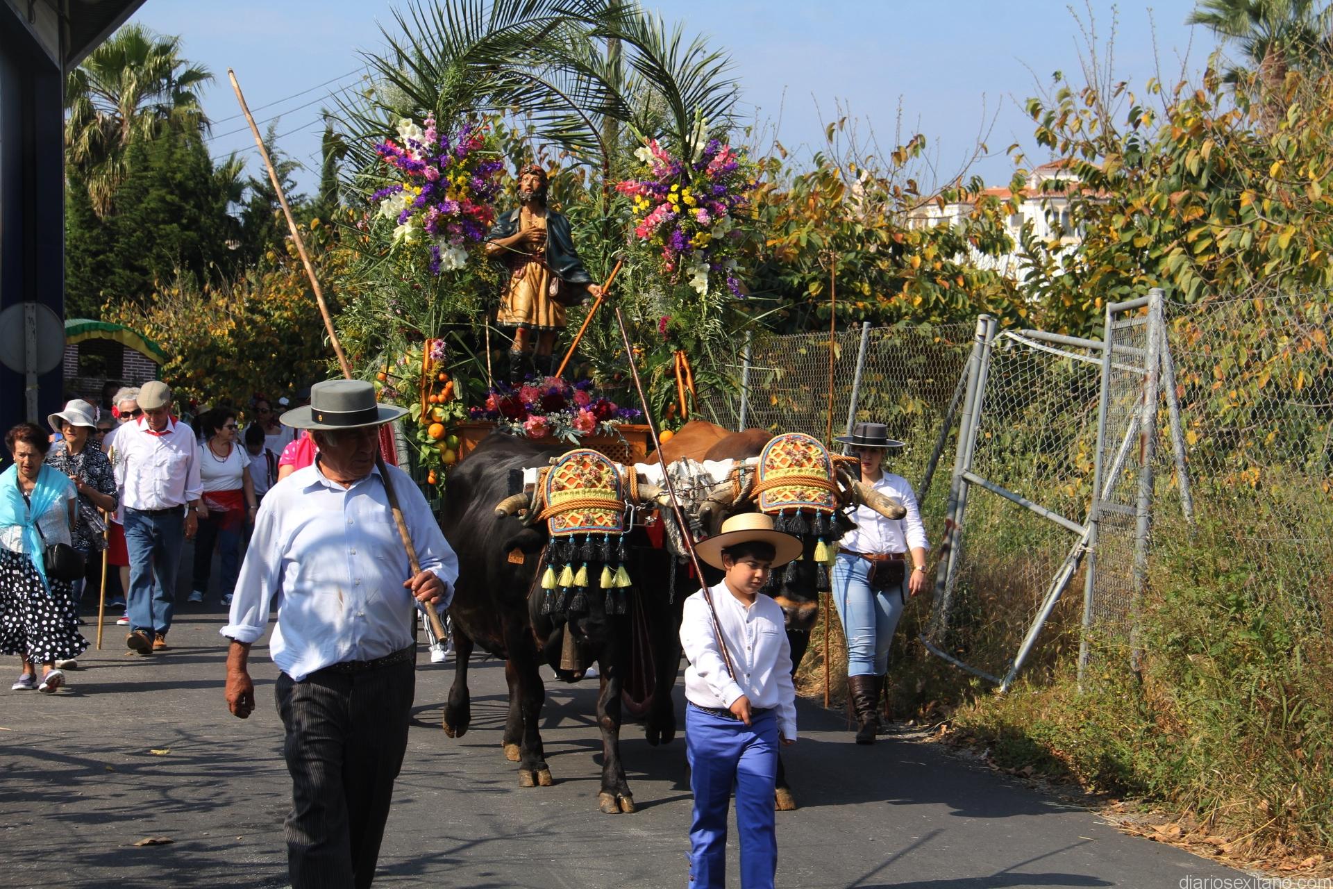 El cortejo, encabezado por la Imagen de San Isidro que ocupaba un carro tirado por bueyes, llegados desde la localidad malagueña de Almayate, partía hacía el barrio de Torrecuevas. Este año las carretas y romeros volvieron a realizar el itinerario por el centro de Almuñécar evitando cruzar la Carretera Nacional 340, ni tener que bajar al cauce de río Verde por el P-4, como ya ocurrió años atrás, sino que entró en la Vega desde la Carretera del Suspiro del Moro y la calle Molvízar.