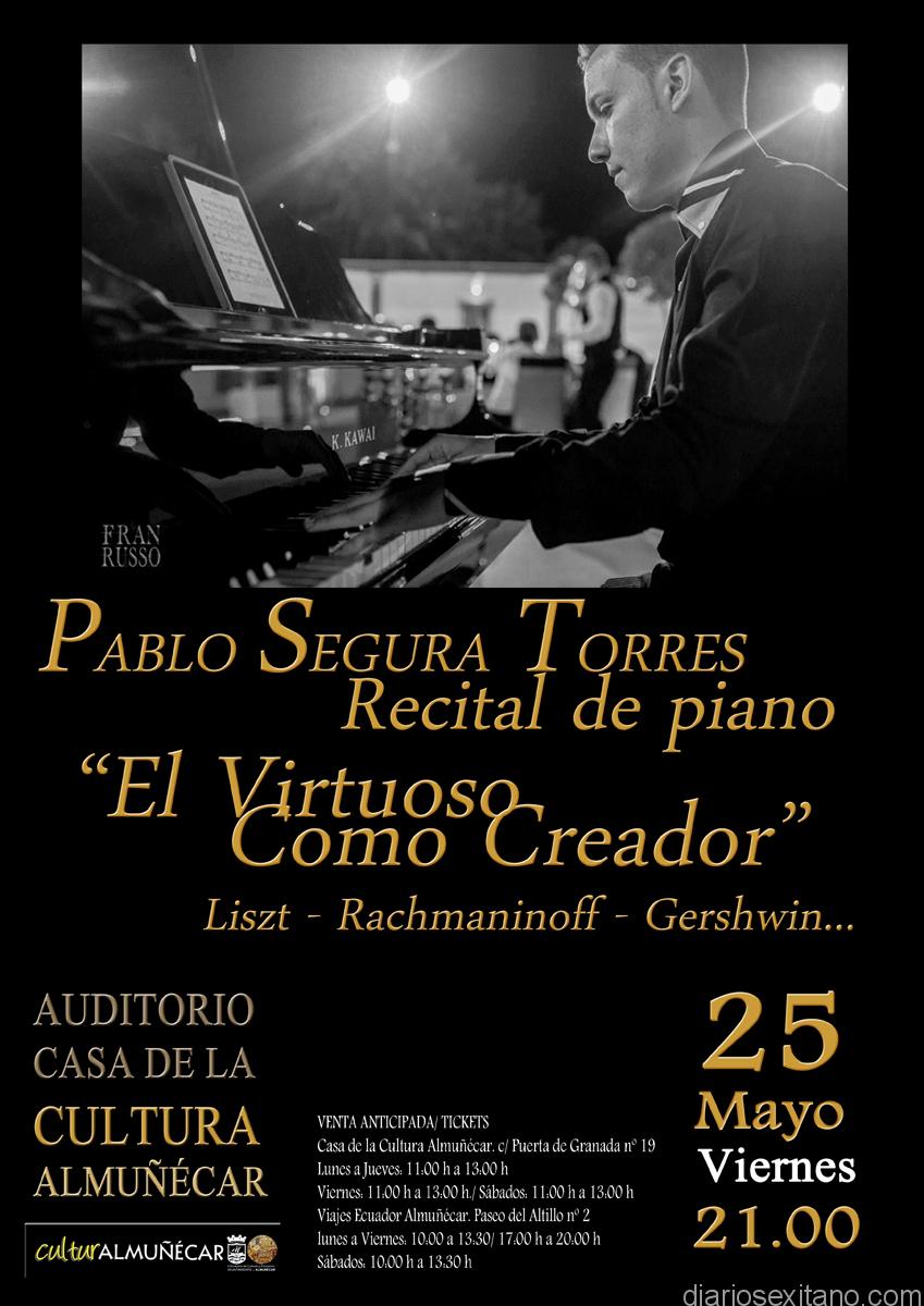 El pianista granadino, Pablo Segura Torres, dará este viernes (21 horas) un recital de piano en el auditorio de la Casa de la Cultura de Almuñécar, bajo el titulo “El virtuoso como creador”.