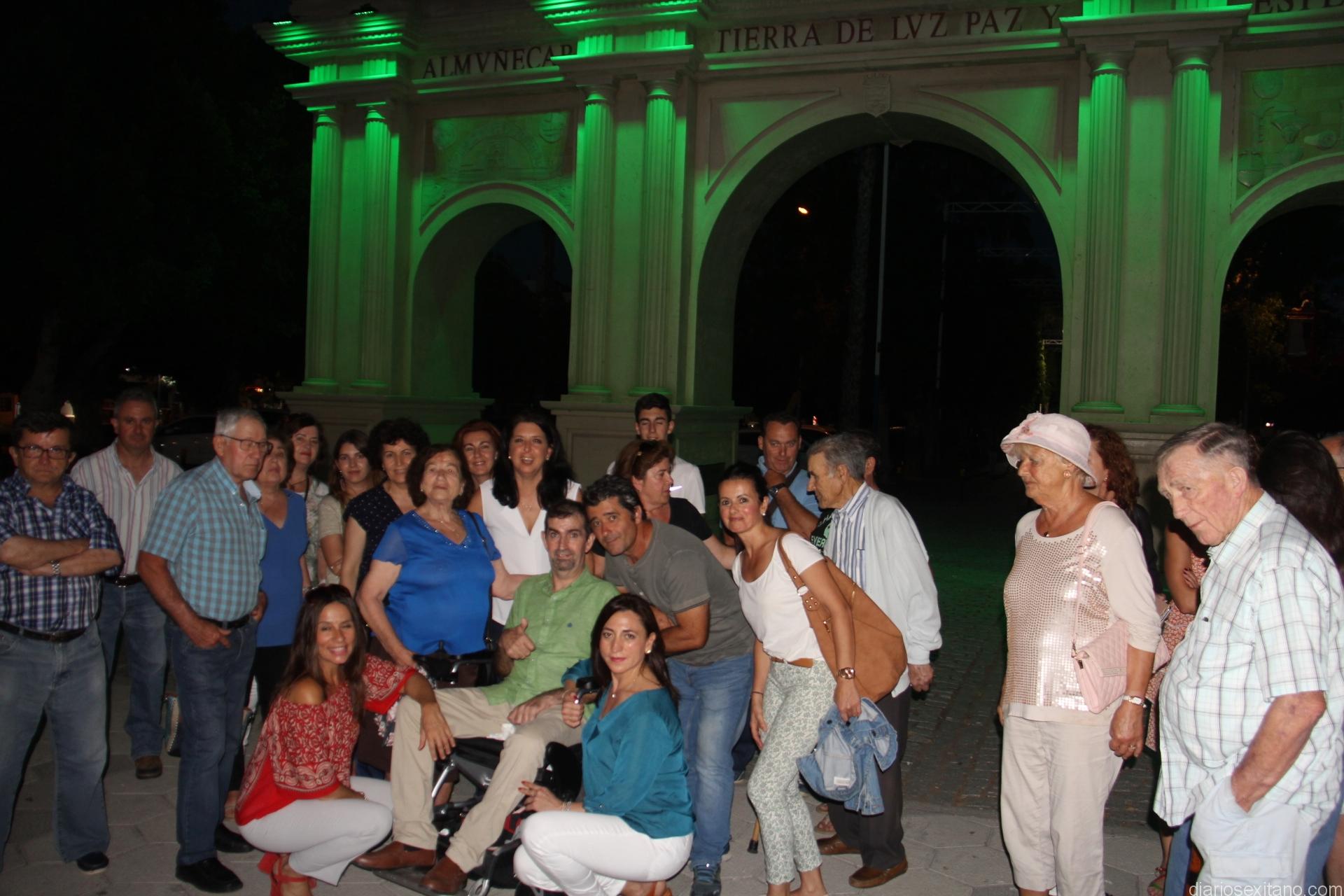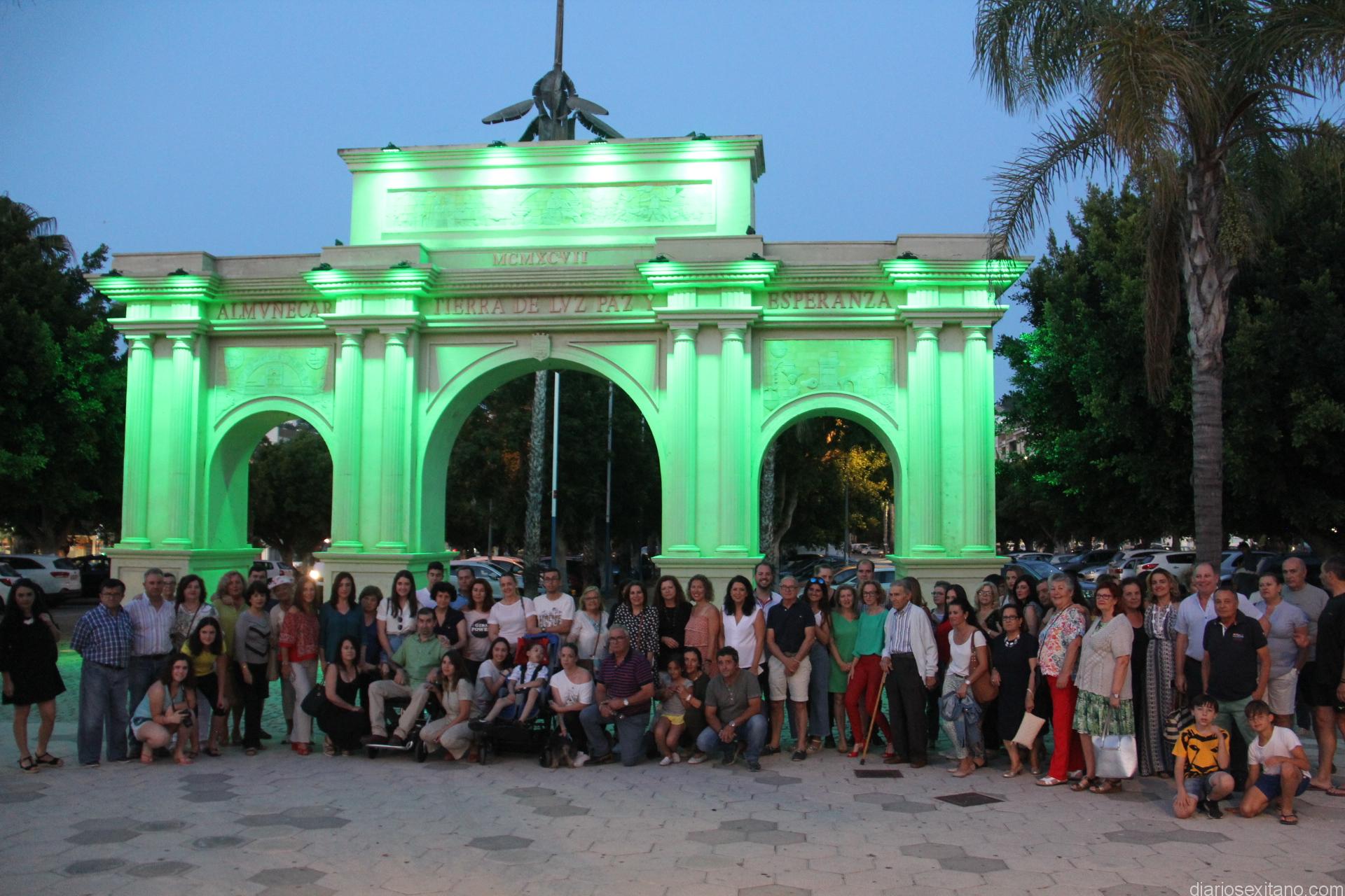 Al llegar la noche, pasadas las 21,30 horas, se iluminó de verde “esperanza” la Puerta de Almuñécar, situada junto al parque Blas Infante (recinto ferial y mercadillo). En este lugar se concentraron más de medio centenar de personas, entre las que estaban los ediles de Servicios Sociales y Agricultura, María del Carmen Reinos y Francisco Alba, respectivamente, se sumaron a la concentración convocada por miembros de la Asociación ELA Andalucía y el Área de Servicios Sociales sexitana, para mostrar el compromiso social con la visibilidad de esta tremenda enfermedad y para pedir que no cese la investigación, la búsqueda de una cura para esta enfermedad neurodegenerativa que se refleja en algunos vecinos sexitanos. #LuzporlaELA