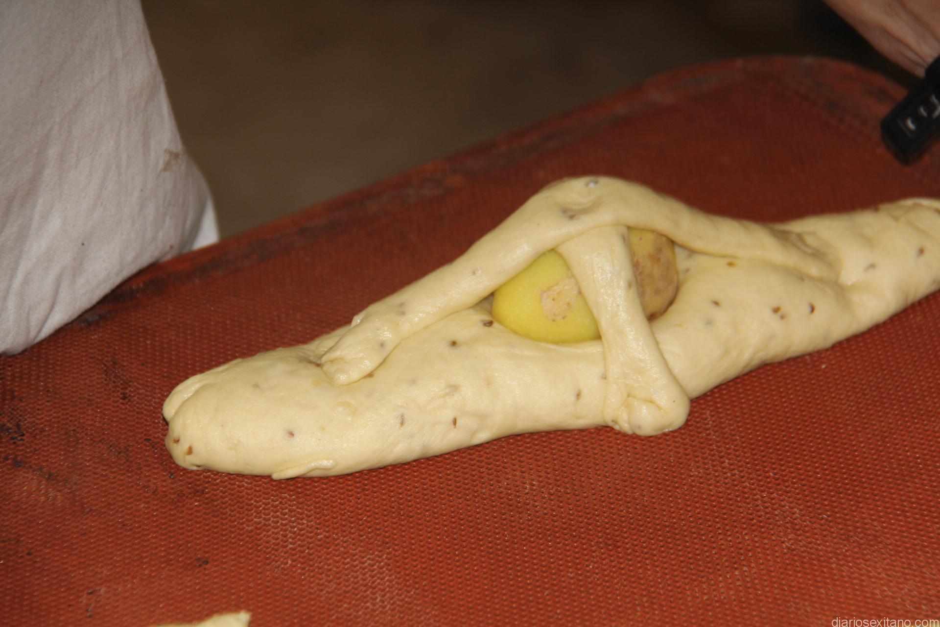 “El bollo se hace con una masa especial donde no falta, además de la harina, el aceite de oliva, matalauva y el huevo, como ingredientes más destacados. Este año se realizaron además bollos pequeños adornados de huevos de codorniz y otros bollos de dos huevos y elementos especiales por encargo, como no”, manifestaba José Jiménez, mientras no dejaban de sacar y meter carros de bandejas en el horno.