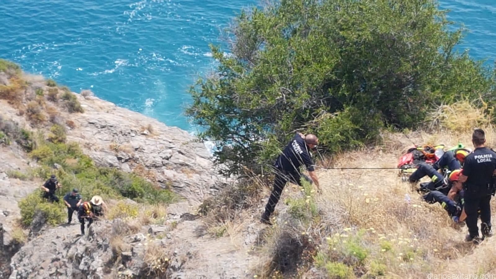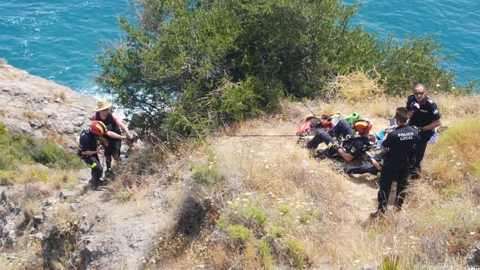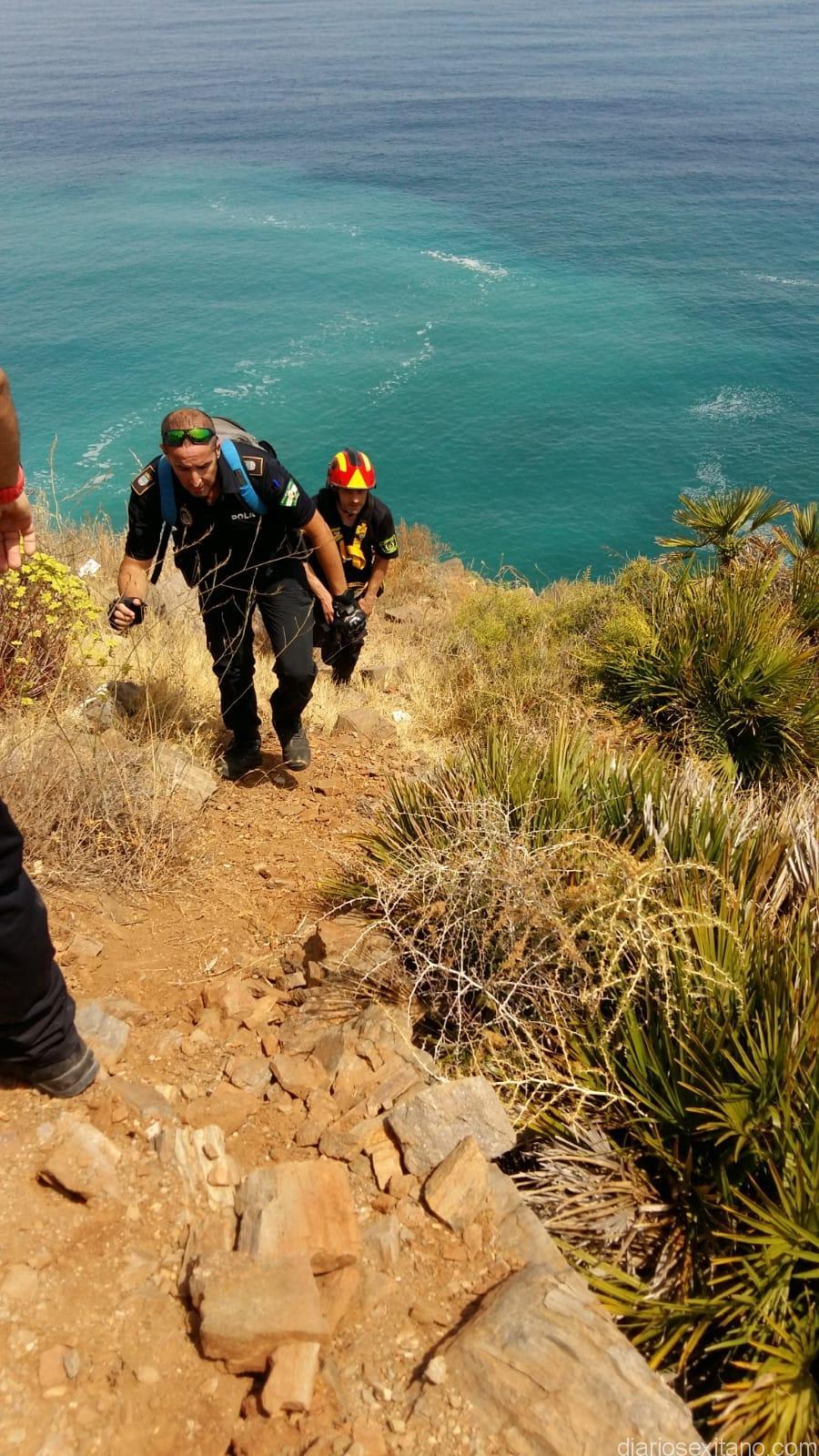 Ya en el lugar los bomberos sexitano, ayudados con cuerdas, se descolgaron hasta el lugar donde estaba el hombre, un joven de origen alemán que había salido a realizar senderismo con su padre, éste salió pero le hijo no podía.” En principio, explicó al agente de la Policía Local de Almuñécar, se llamó a un helicóptero de la Guardia Civil para el rescate, pero cuando llegó ya no hacía falta porque entre todos conseguimos rescatarlo ayudado con las cuerdas “.