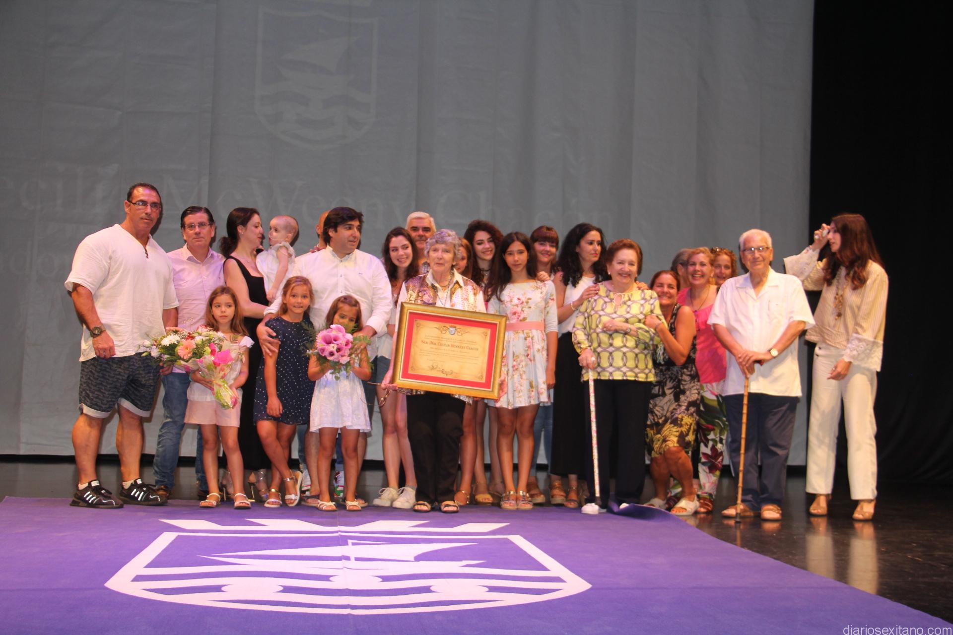 La homenajeada recibió de manos de la alcaldesa de Almuñécar, de la medalla de la ciudad y el acuerdo por unanimidad del pleno enmarcado a la homenajeada. Cecilia Chacón emocionada, como la mayoría de los asistentes, entre los que estaban numerosos corporativos sexitanos y ex–párroco de Almuñécar, Eugenio Valero, solo pudo decir: “Mil gracias. Sin Jesucristo en mi vida, quizás hubiera sido diferente”, acordándose de su padres, tíos y su difunto esposo, Francisco Chacón, mientras sus nietas les entregaban ramos de flores y recibía los aplausos de familia, amigos y vecinos puestos en pie.