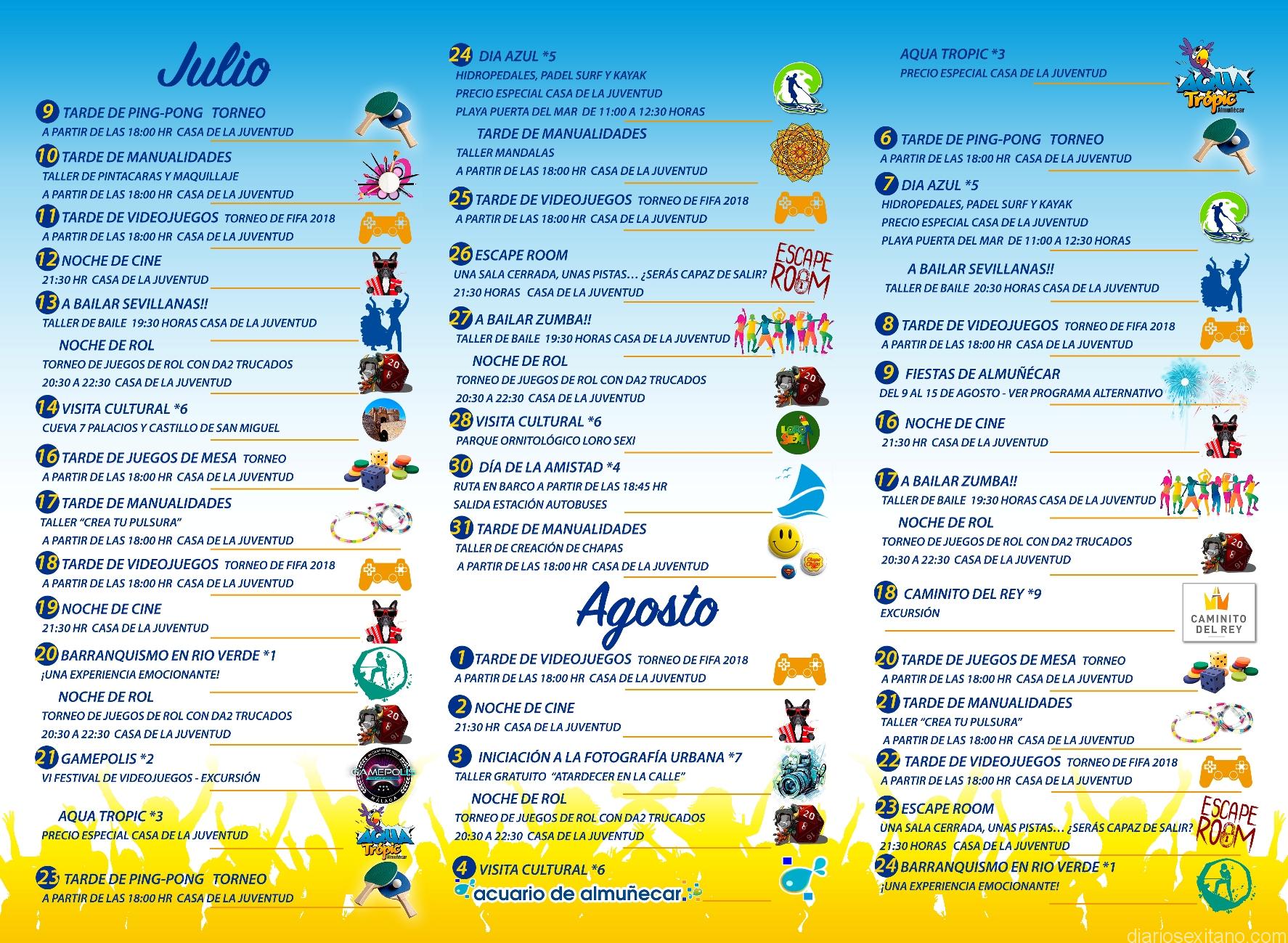 La concejal delegada de Juventud del Ayuntamiento de Almuñécar, María del Mar Medina, ha presentado el programa de Ocio Alternativo para este verano “con casi un centenar de actividades para todos los gustos: culturales, deportivas, animación, talleres, cine, visitas guiadas, juegos…con ello queremos abarcar todos los gustos y alternativas posibles”, dijo.