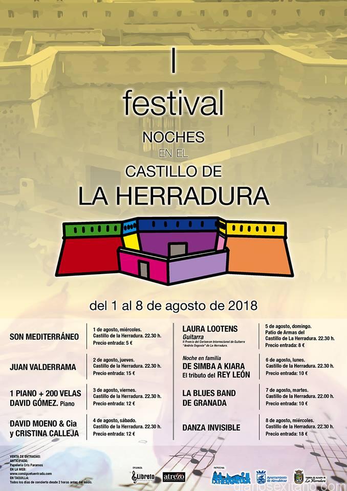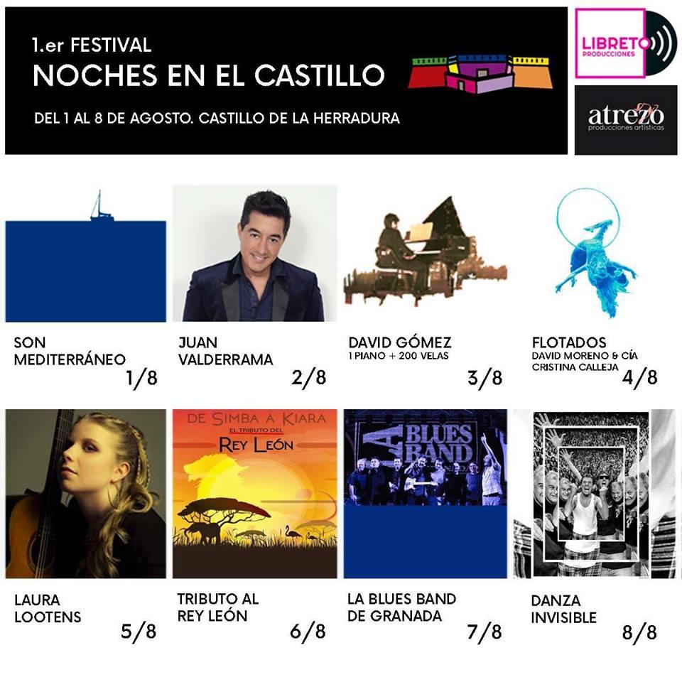 El programa del I Festival Noches en el Castillo de La Herradura, que organiza, Libreto Producción, con la colaboración de la Tenencia de Alcaldía de La Herradura, arrancará el día 1 de agosto con un concierto del grupo “Son Mediterráneo”; para el día 2 agosto se anuncia la actuación de Juan Valderrama. El programa seguirá el viernes, día 3 de agosto, con el concierto denominado “1 Piano y 200 Velas” que interpretará el pianista y compositor David Gómez; para el 4 de agosto, llegar al escenario la actuación de David Moreno y Cristina Calleja; el domingo día 5, concierto de la guitarrista alemana Laura Lootens (segundo premio del último Certamen Internacional de Guitarra “Andrés Segovia ). Ya en la recta final del festival herradureño se anuncia la actuación el día 6 de agosto del espectáculo “De Simba a Kiara . Tributo del Rey León”. Al día siguiente se anuncia el concierto de la Blues Band de Granada. El broche final lo pondrá el miércoles día 8 de agosto, el grupo de popo malagueño, Danza Invisible.