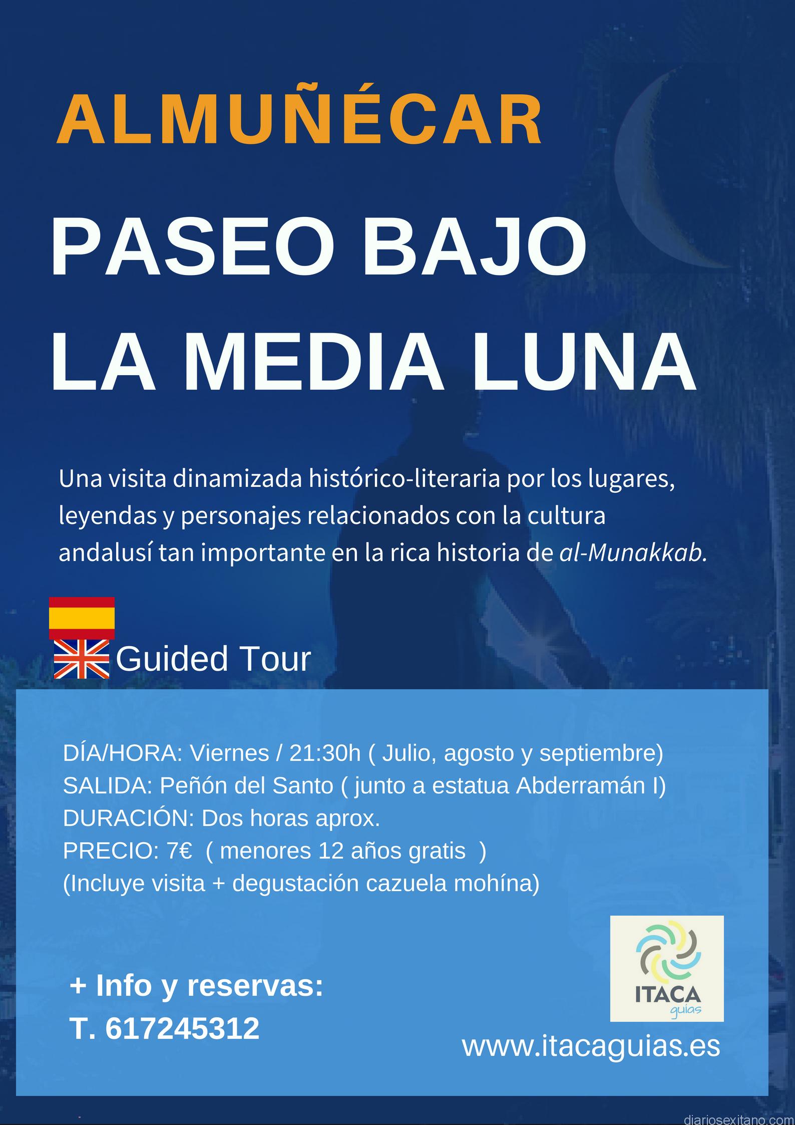 Durante el mes de agosto siguen celebrándose la visitas guiadas nocturnas denominadas “Almuñécar: Paseo bajo la media luna”, que, por sexto año consecutivo, se llevan a cabo por el casco histórico sexitano “con el fin de ofrecer a los turistas y residentes una forma especial de descubrir parte del legado que los musulmanes dejaron en esta ciudad” , recordó el responsable de esta iniciativa, Juan Bolívar, de la empresa Ítaca guías .