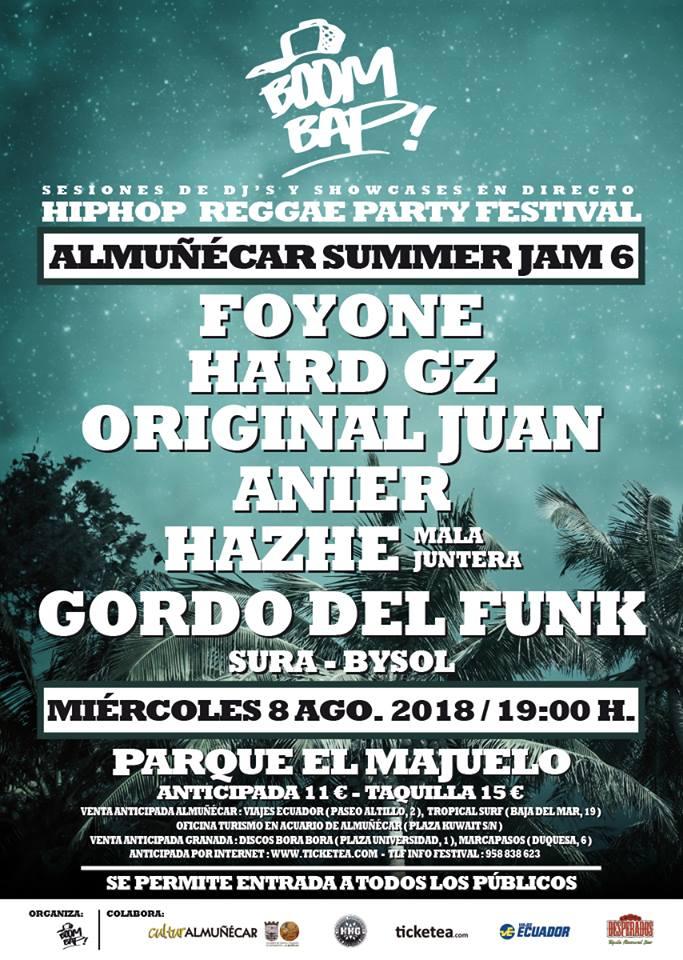 El parque El Majuelo de Almuñécar acoge este miércoles, desde las 19 horas, la gran fiesta del rap veraniego de mayor impacto en Granada y uno de los más destacados de Andalucía con la celebración del festival denominado “ Boom Bap¡ Almuñécar Summer Jam 6”, donde actuarán: Foyone, Harz GZ, Original Juan, Anie, Hazne Mala Juntera, Gordo del Funk, Sura- Bysol. Toda una exhibición de djs y showcases en directo, que cumple su sexto año consecutivo que cuenta con la colaboración de la Concejalía de Cultura de Almuñécar.