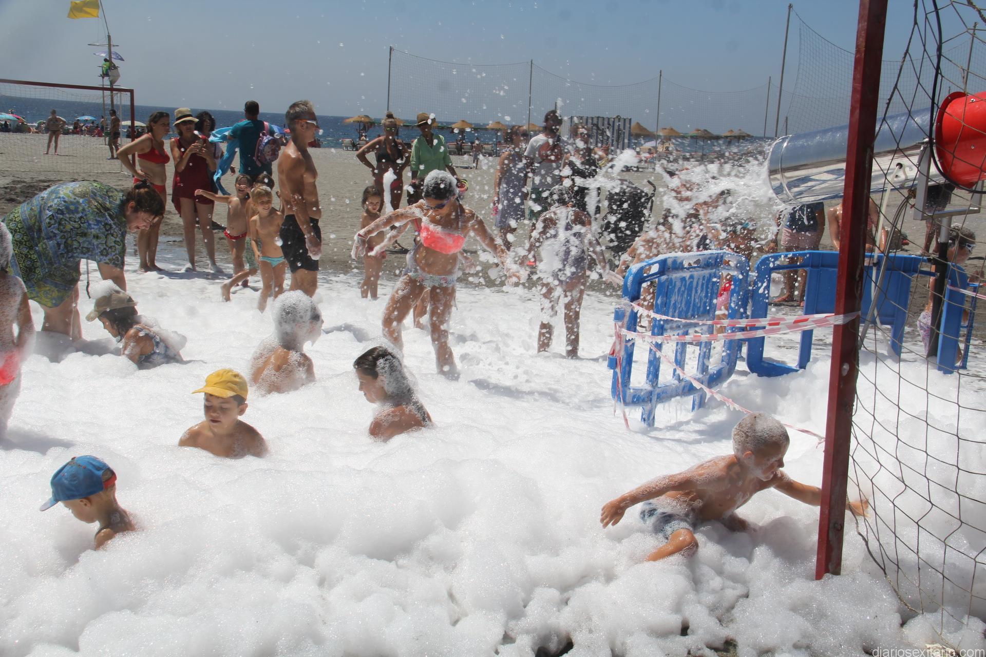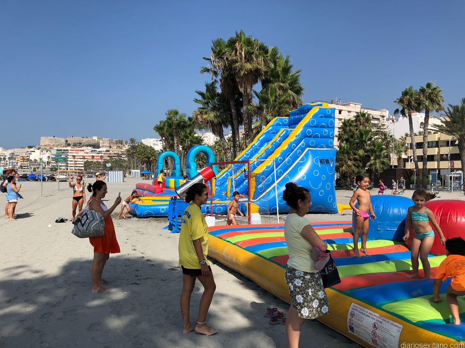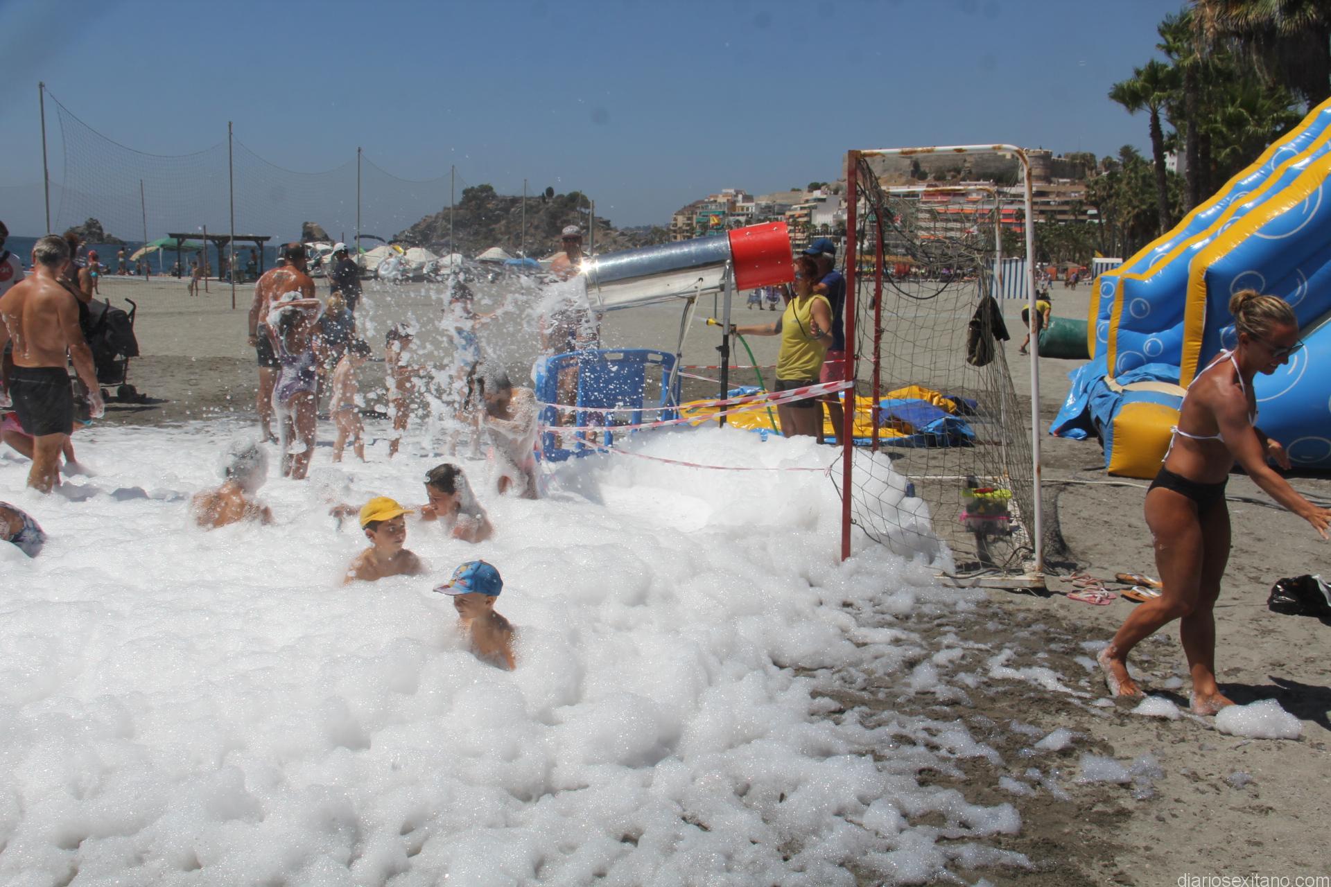 Decenas de pequeños han disfrutado esta mañana de la gran fiesta infantil de toboganes acuáticos e hinchables que han ocupado una zona de la playa Puerta del Mar, de Almuñécar, donde el agua y la espuma han sido principales atractivos para los asistentes.