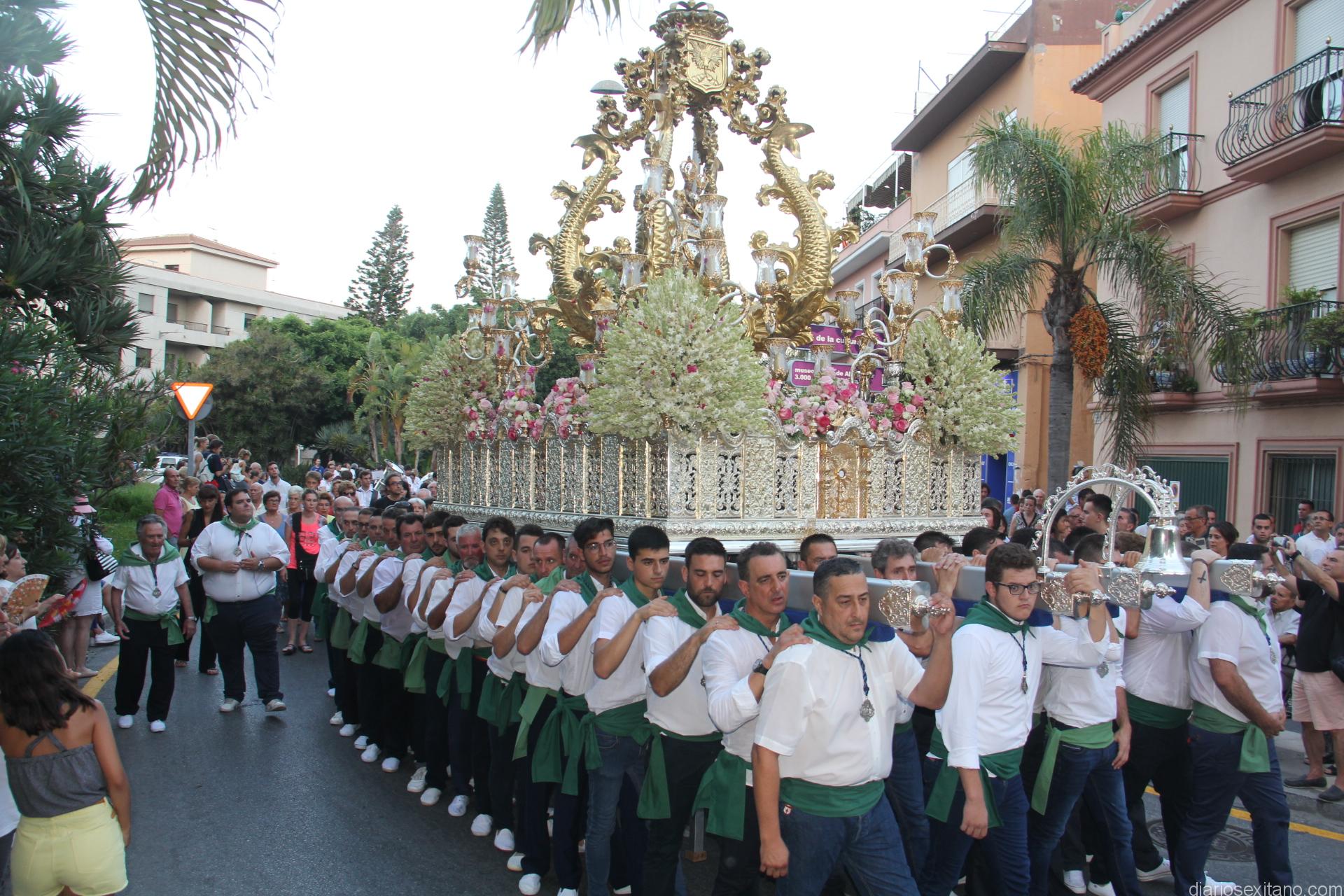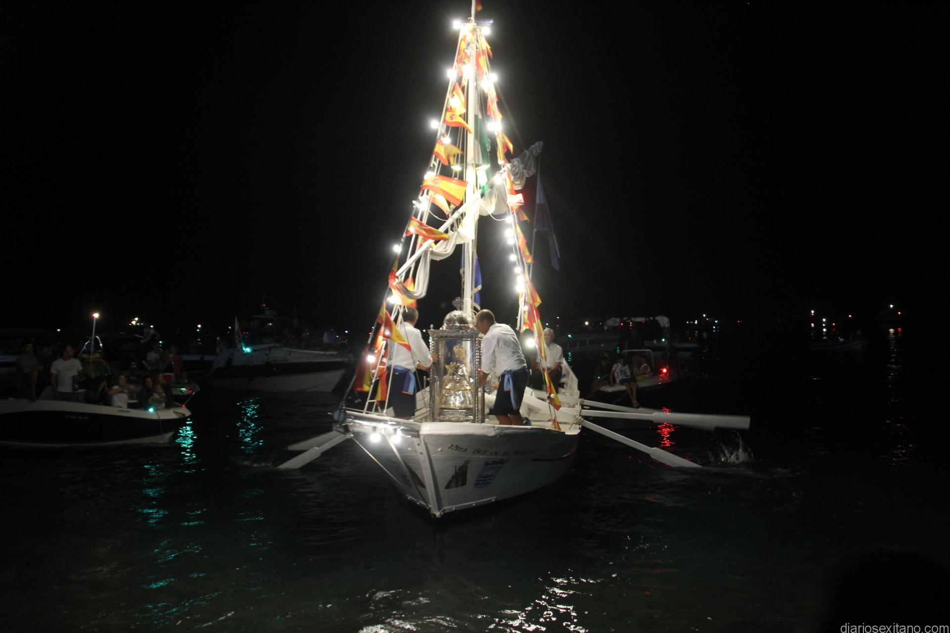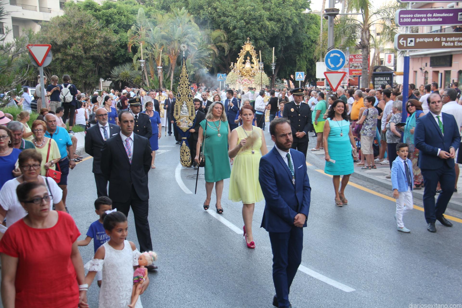 Mientras tanto en el mar, decenas de embarcaciones acompañaban la Barca de la Virgen que con media docena de remeros había partido desde la playa San Cristóbal pasadas las 22,30 horas. A donde llegó tras la solemne procesión que partió desde la Iglesia de la Encarnación a las 20 horas, presidida por representaciones de cofrades e institucionales, encabezada por la alcaldesa, Trinidad Herrera, y el cura párroco, Vicente Guerrero, así como el cortejo de un grupo del folclore tradicional de la zona, formado por cante, instrumentos y baile del Fandango Cortijero que en determinados puntos del recorrido dieron cuenta del mismo. El paso de la patrona estuvo acompañado por la Banda Municipal de Música de Almuñécar, bajo la dirección de Manuel Vargas. Tras la procesión el ferial se llenó de público para despedir las fiestas patronales 2018.