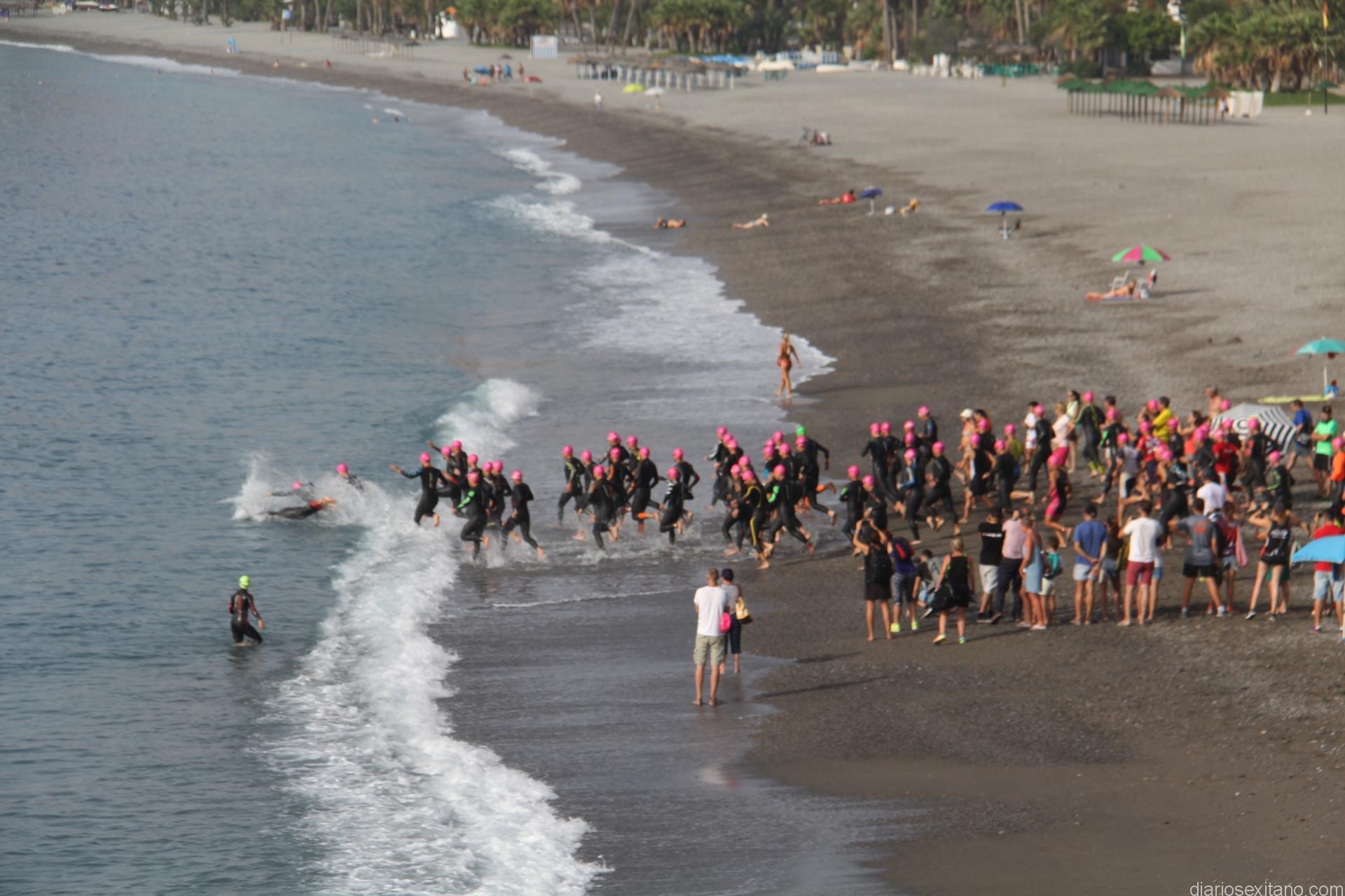 La tercera edición del Triatlón Cros Sexitano, que organizó el Club Triatlón Nazarí de Almuñécar contando con el apoyo del Patronato Municipal de Deportes, Policía Local, Protección Civil y empresas locales , fue “increíble, grande, divertida, amable gente, bien organizado, durísimo”, Así lo describieron los atletas participantes a llegar a meta. Y es que a la dureza de la prueba en las tres transiciones se sumaba el calor que a medida que avanzaba la mañana fue reflejándose entre los atletas.